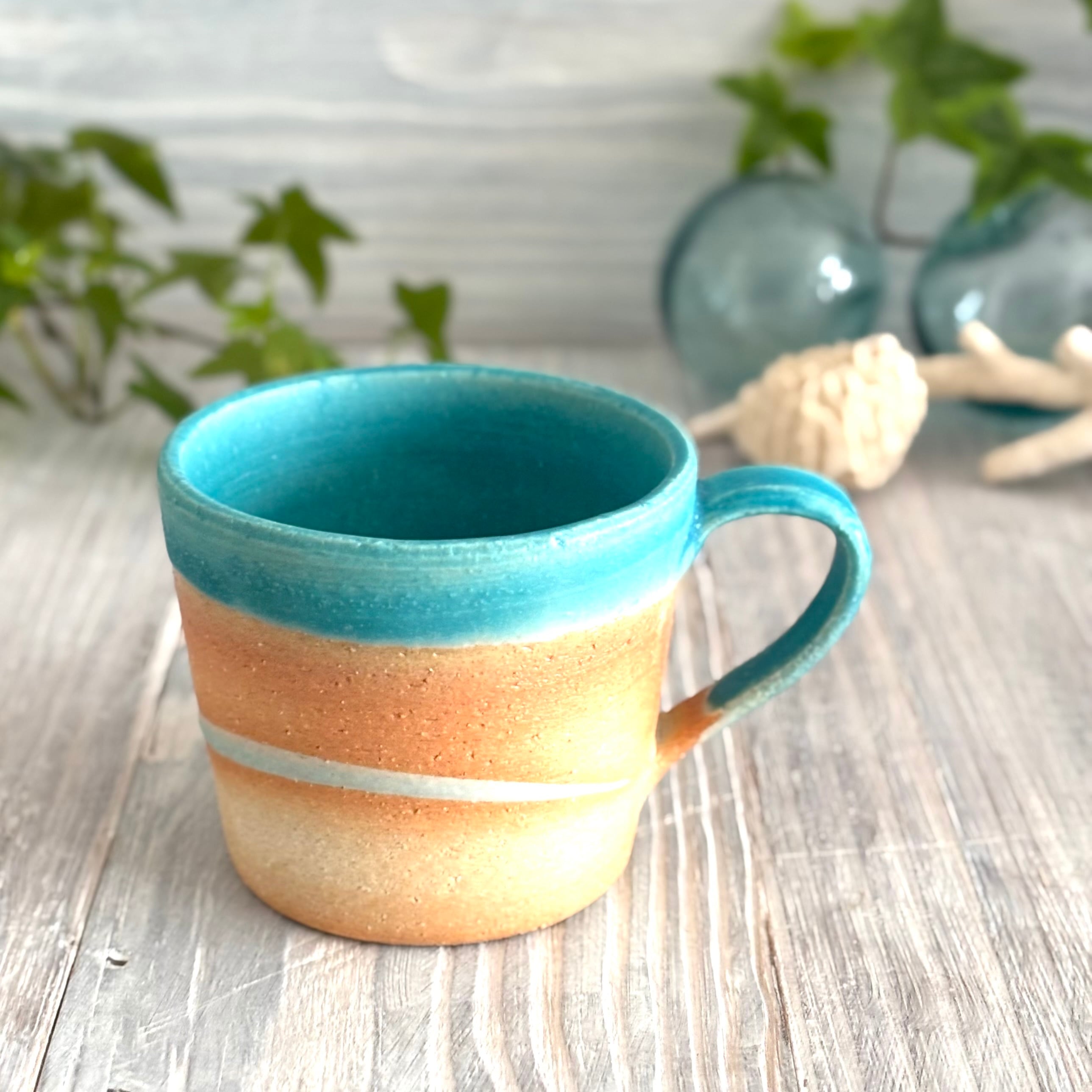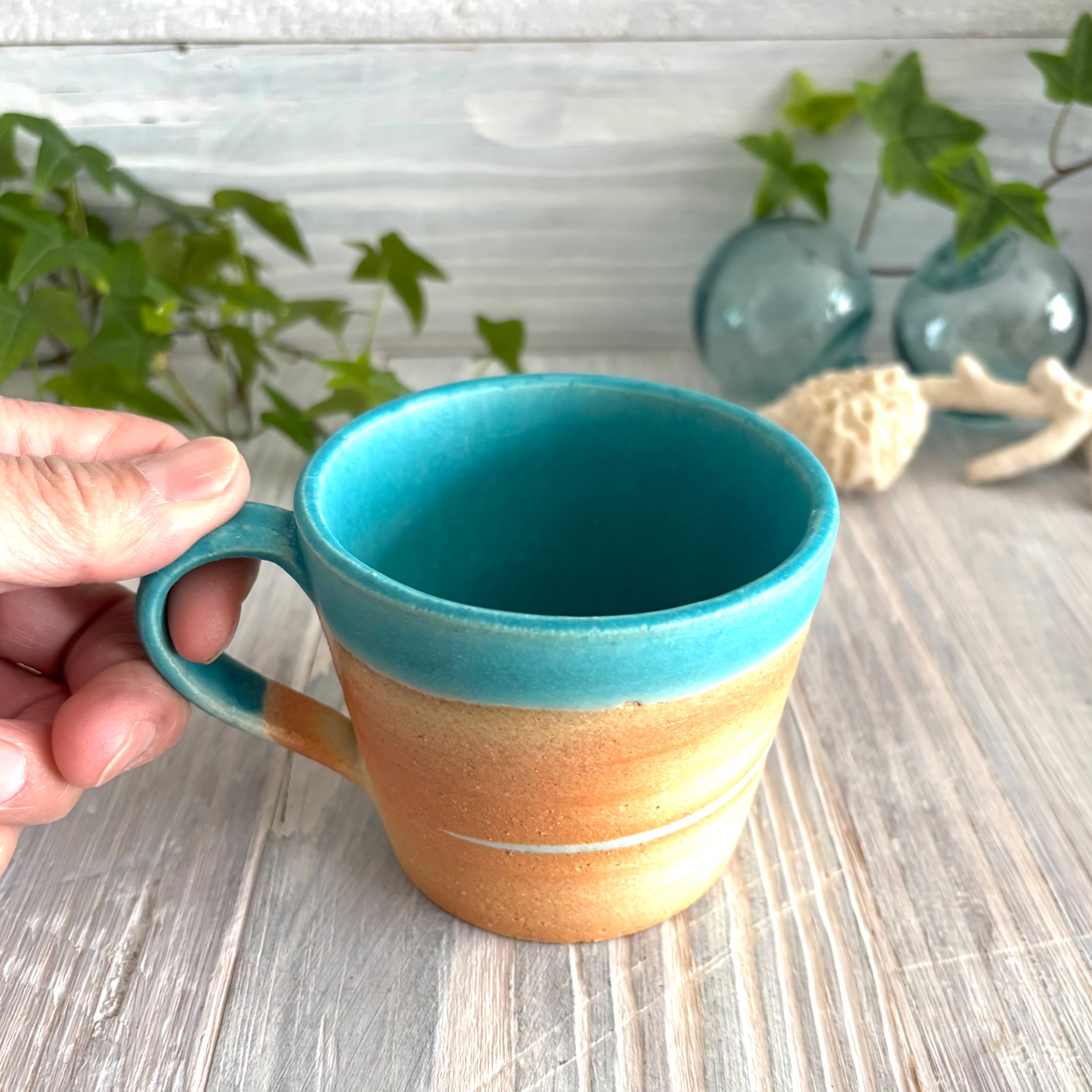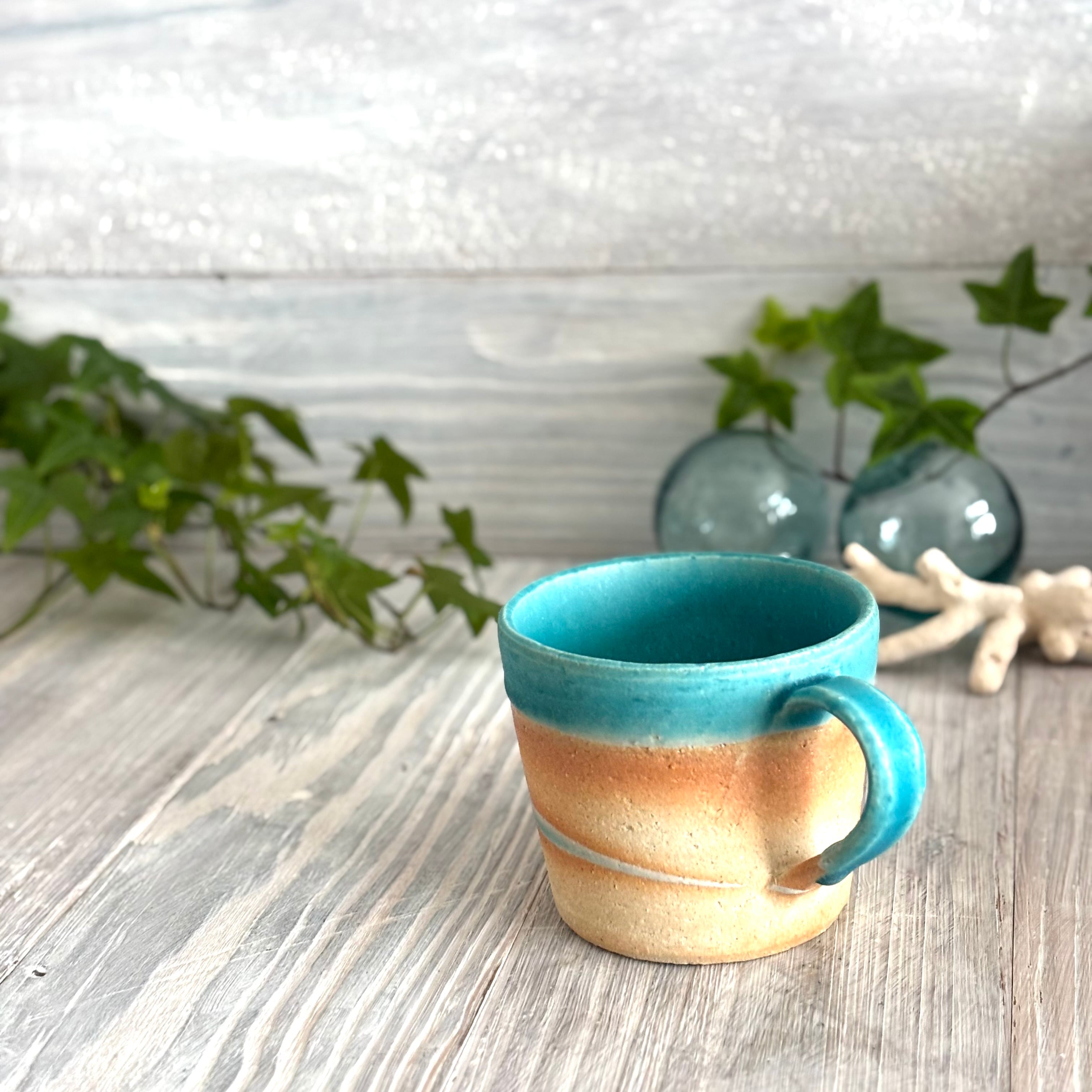 色鮮やかなマットのトルコブルーとビーチの様なウェーブが特徴のマグカップです。