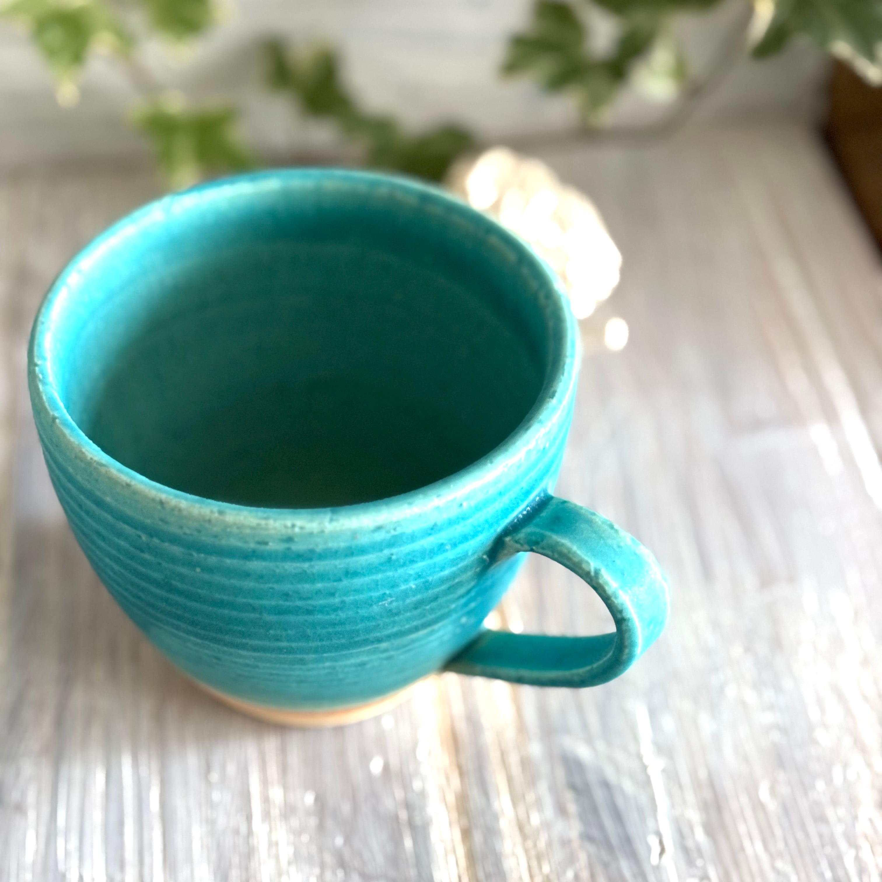 色鮮やかなマットのトルコブルーが特徴の容量たっぷり、大きめのマグカップです。食卓に海を感じる食器をどうぞ。モダンテイストにも合うので、西海岸スタイルや北欧スタイルなど、どんな場面でもお使いいただけます。