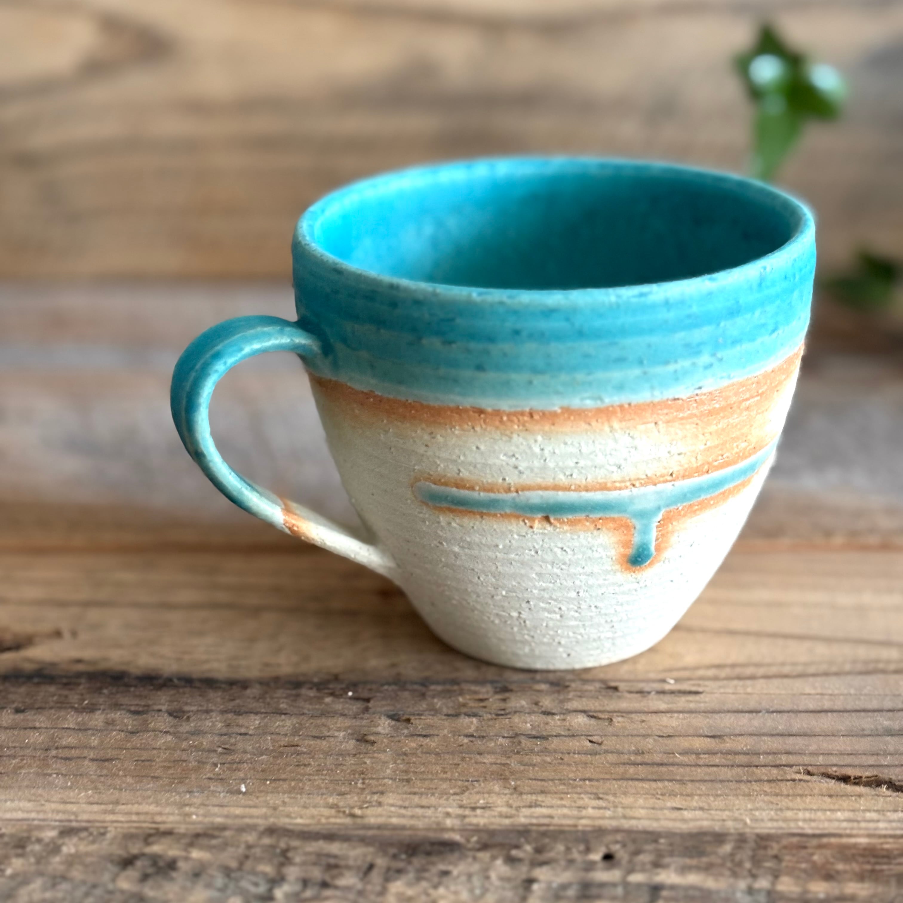 色鮮やかなマットのトルコブルーに砂浜をイメージした素焼のようなウェーブ模様が特徴の容量たっぷりのマグカップです。食卓に海を感じる食器をどうぞ。