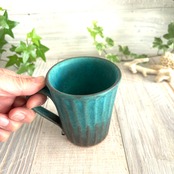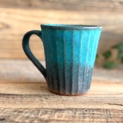 美しいターコイズブルーの色合いが人気の益子焼のシャビーターコイズシリーズ。スマートで使いやすい形状が日常使いにぴったり。カップ側面の縦線模様は「しのぎ」といい、益子焼の職人が一本一本手作業で削り出しています。釉薬の自然な流れや色ムラによるシャビーシックな風合いが魅力。