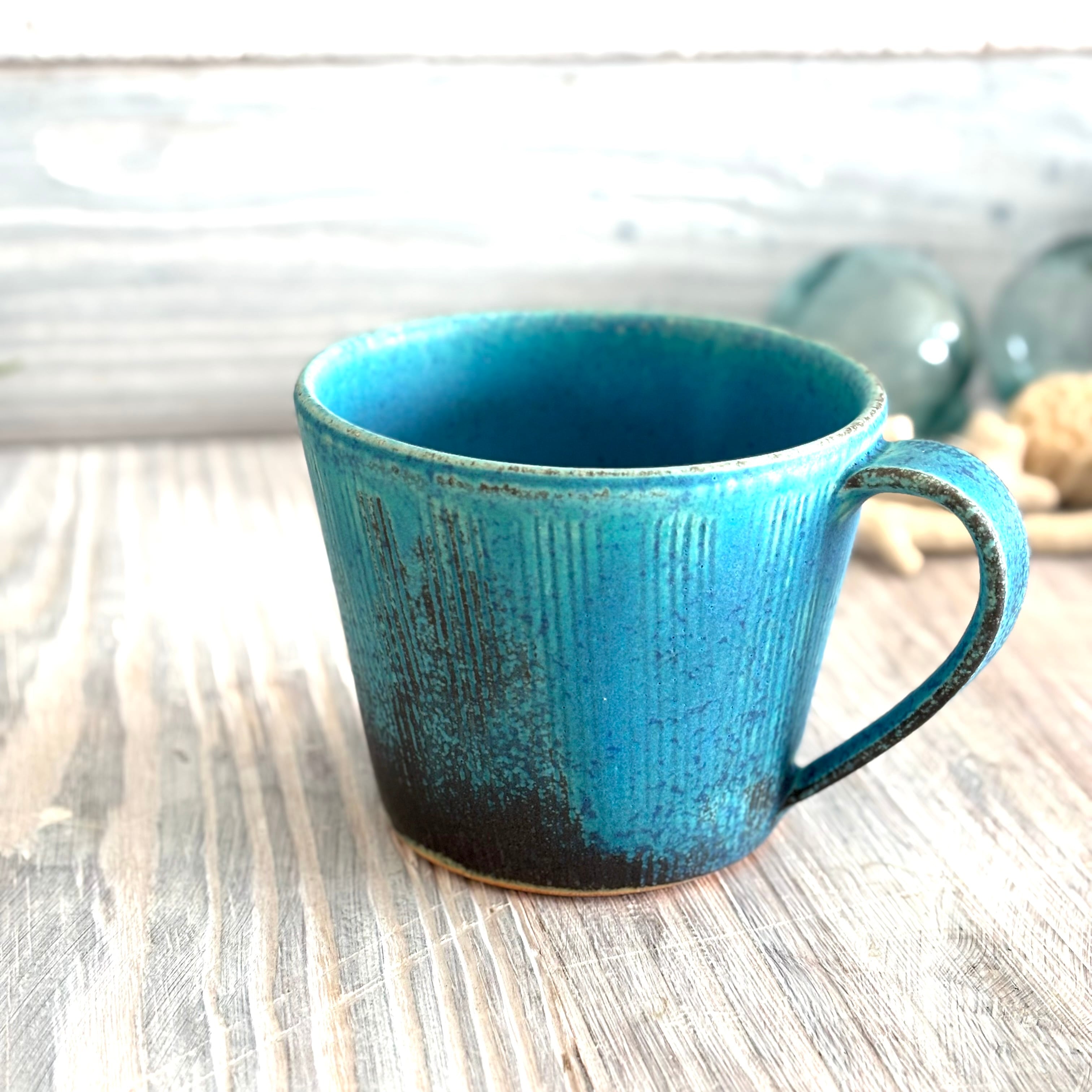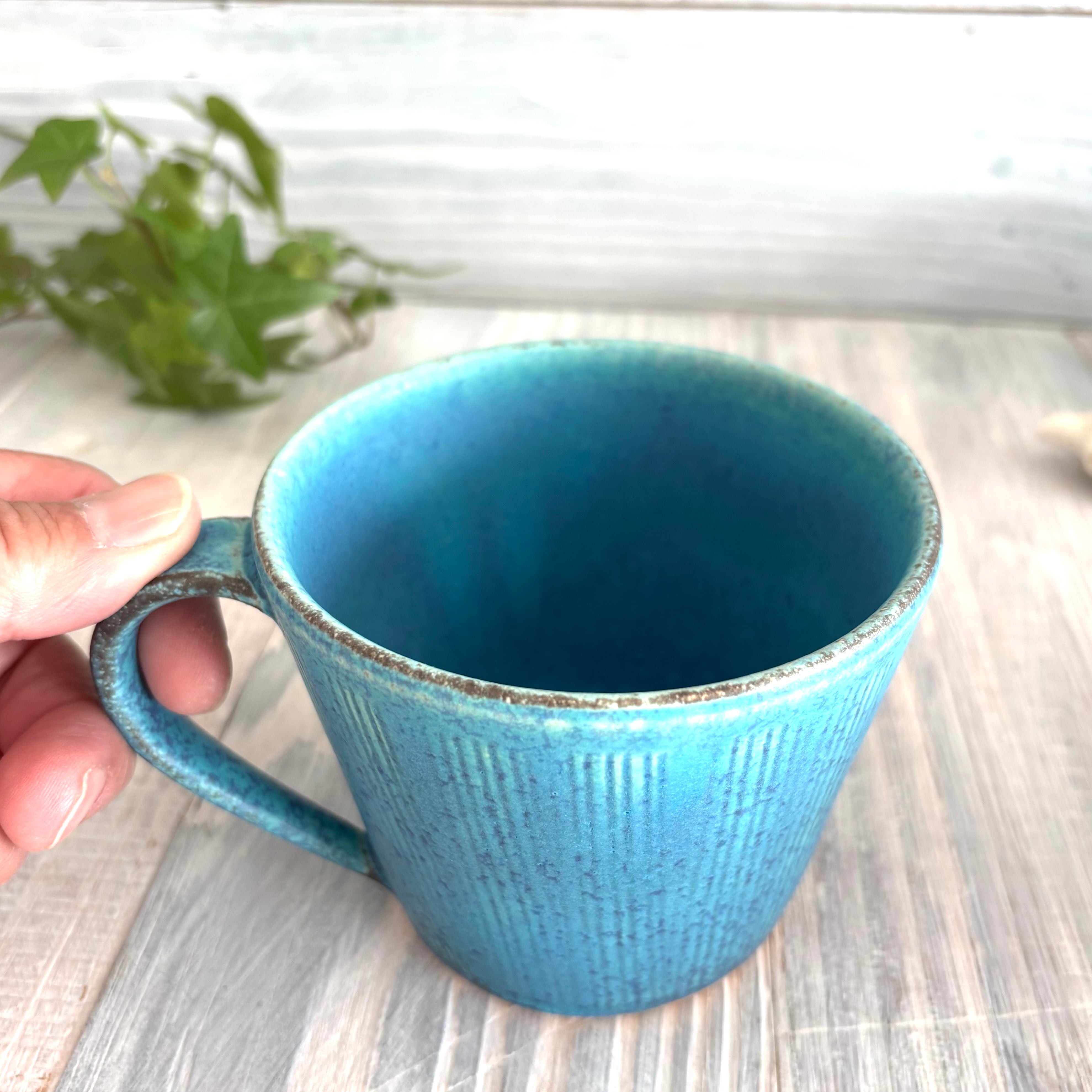 色鮮やかなマットなトルコブルーカラーに表面にくし目がついたマグカップ。「信楽焼」は、滋賀県甲賀市信楽町でつくられているやきもの。日本六古窯の一つと数えられ、1260年もの永い歴史があるといわれています。 1976年(昭和51年)に国から伝統的工芸品の指定を受けています。