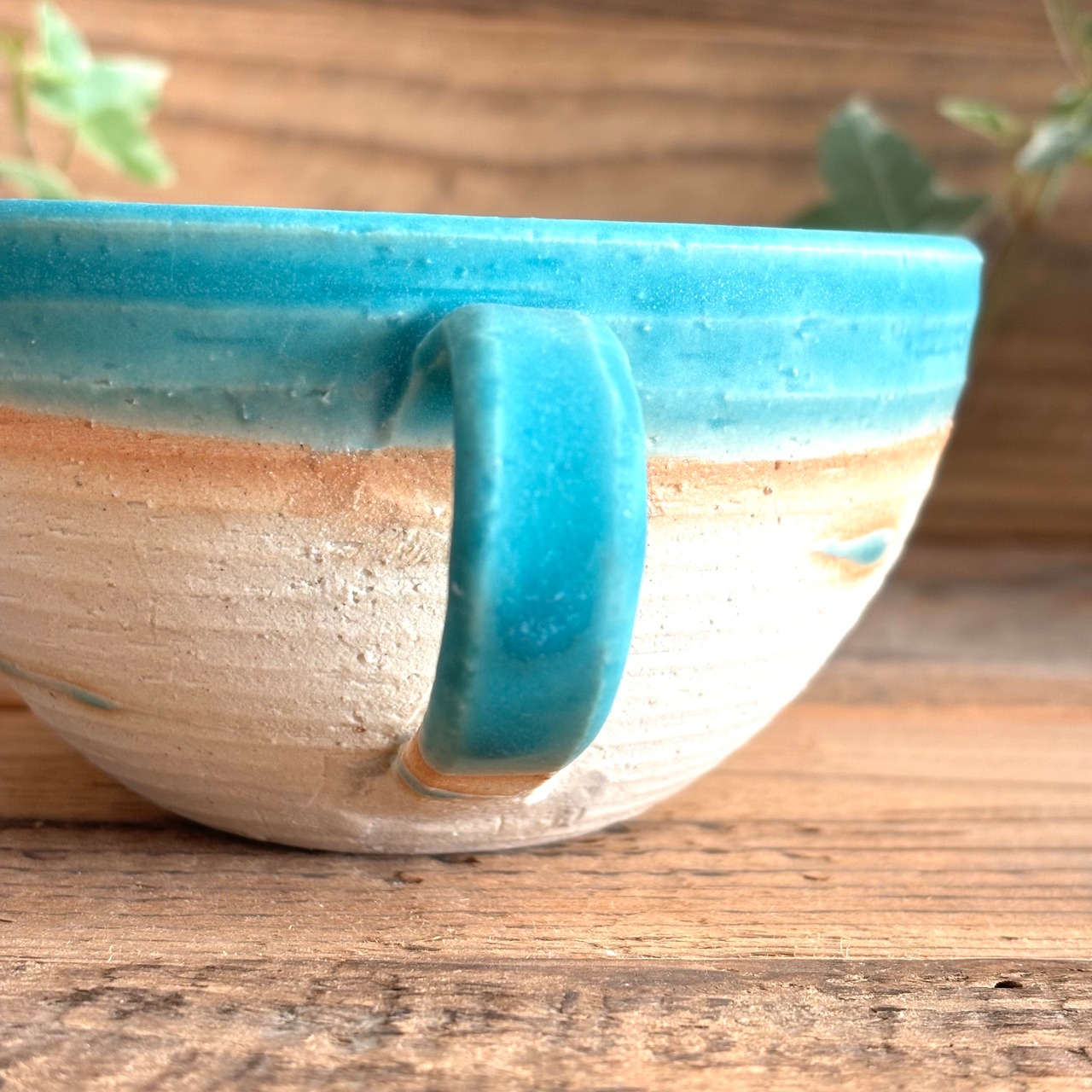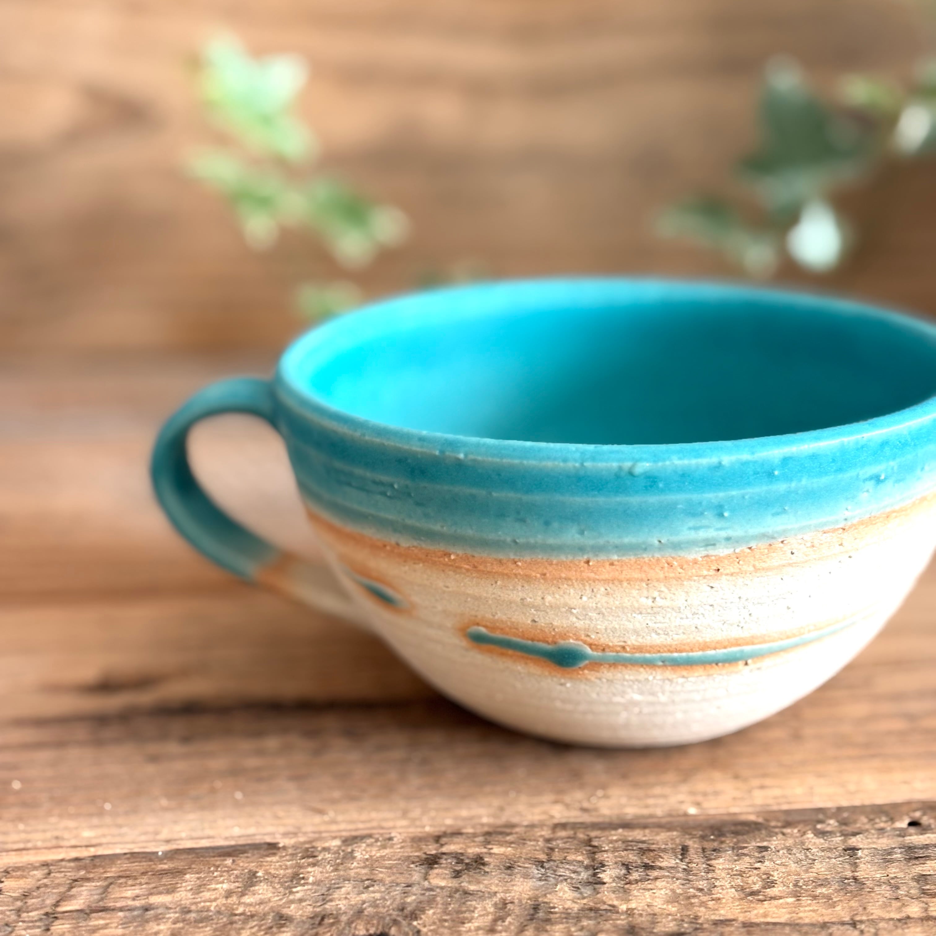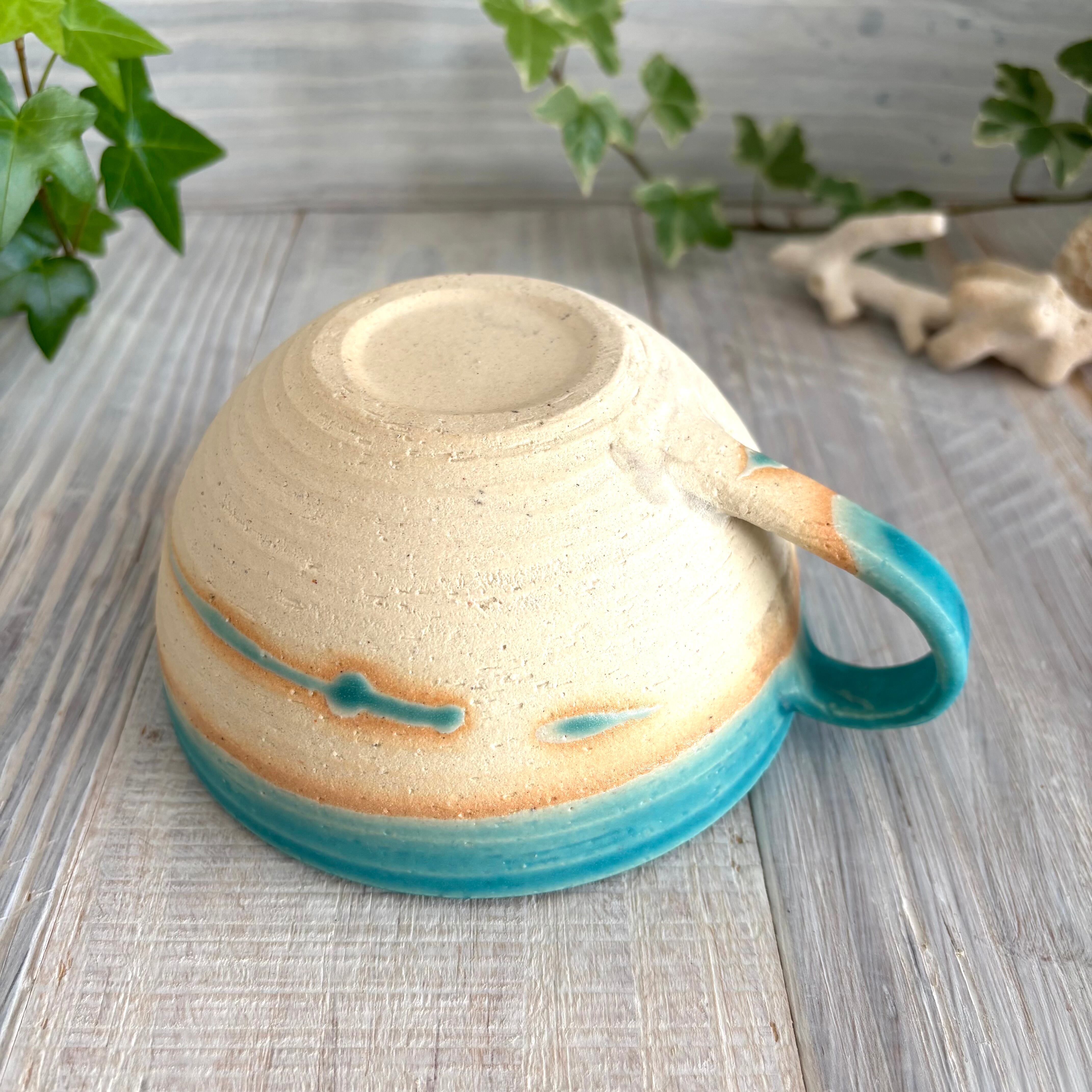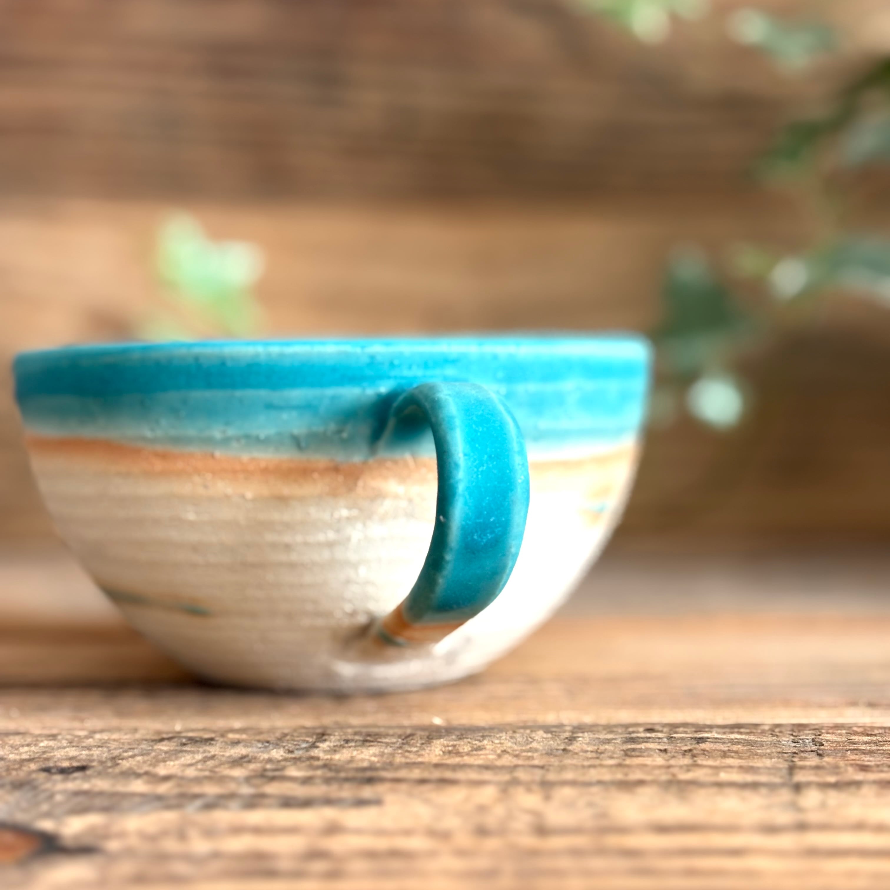 色鮮やかなマットのトルコブルーに砂浜をイメージした素焼のようなウェーブ模様が特徴のスープカップです。