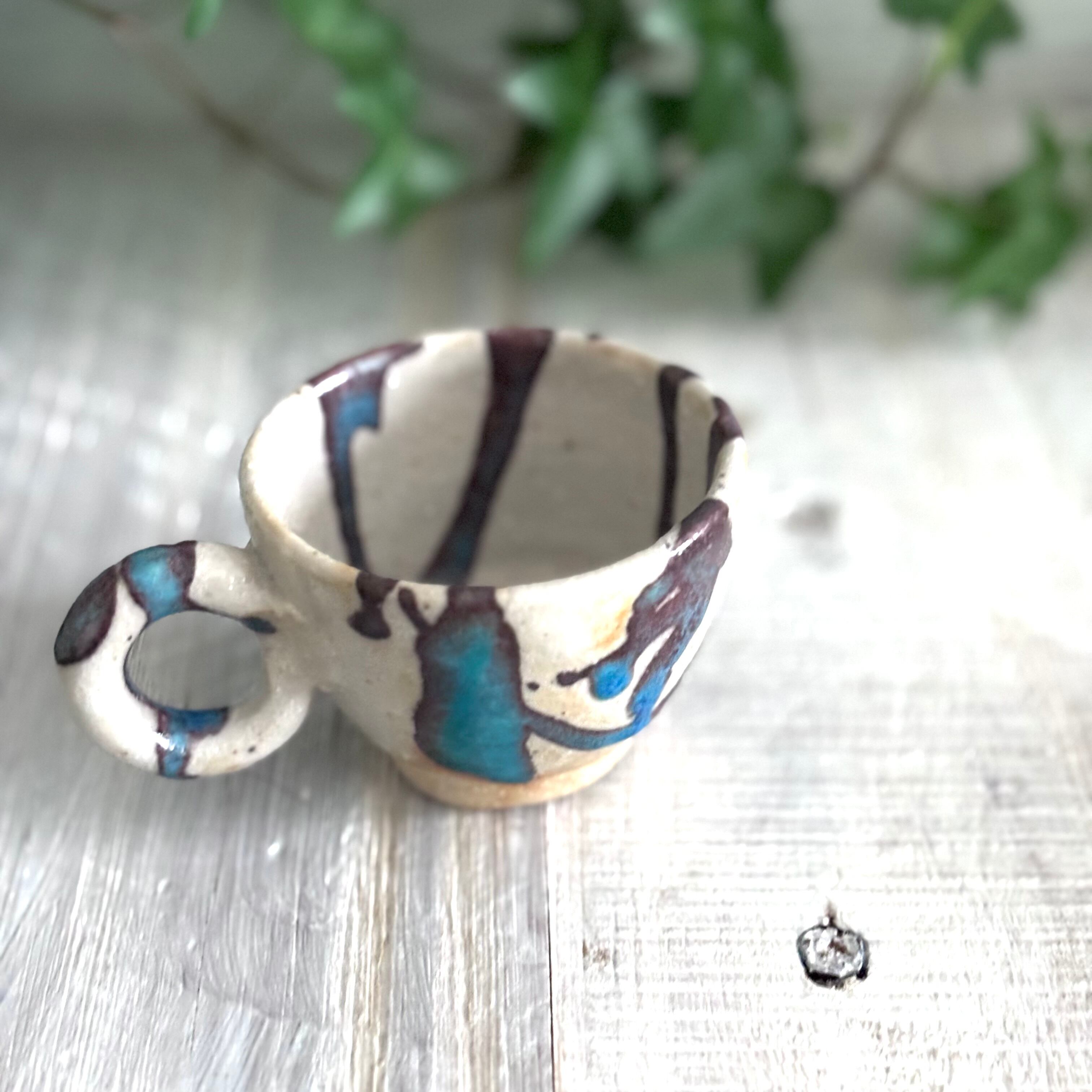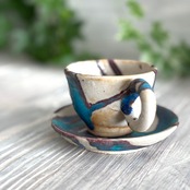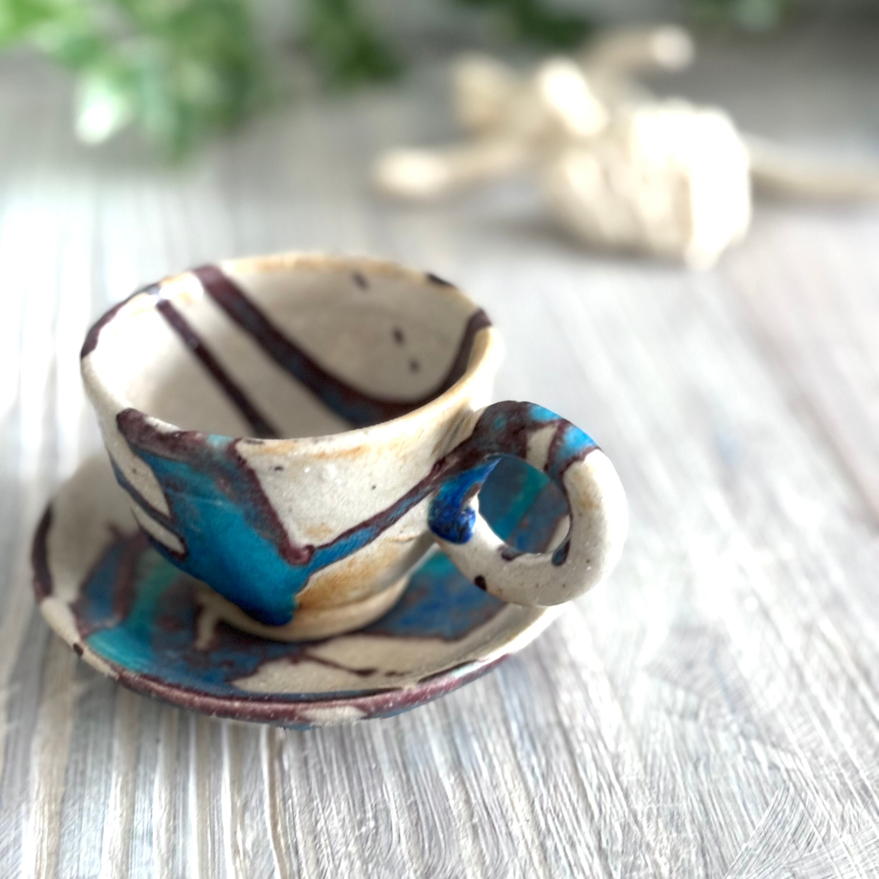 色鮮やかなトルコブルーがランダムに入った氷河シリーズのエスプレッソカップ&ソーサー。取っ手にアクセントのあるかわいいデミタスカップです。信楽焼は、滋賀県甲賀市信楽町でつくられているやきもの。日本六古窯の一つと数えられ、1260年もの永い歴史があるといわれています。