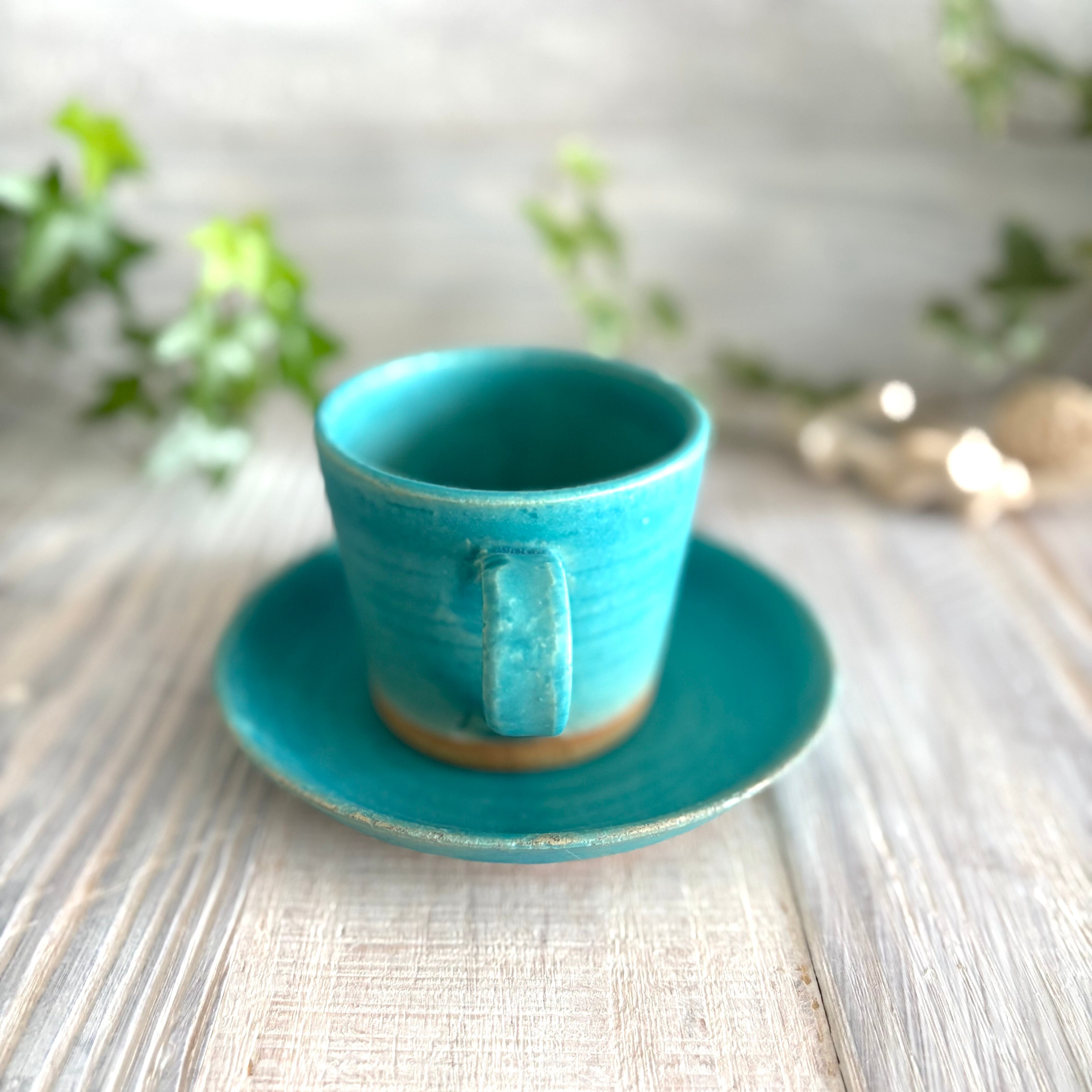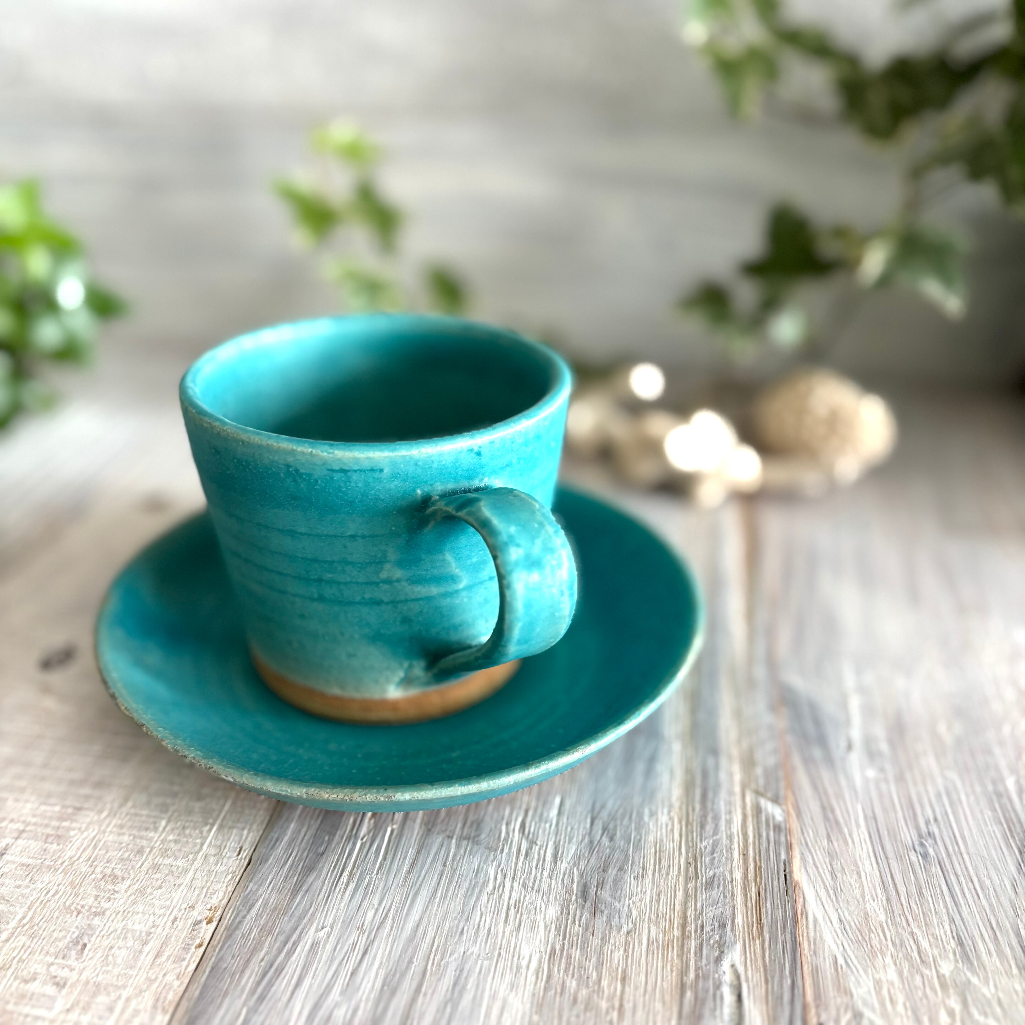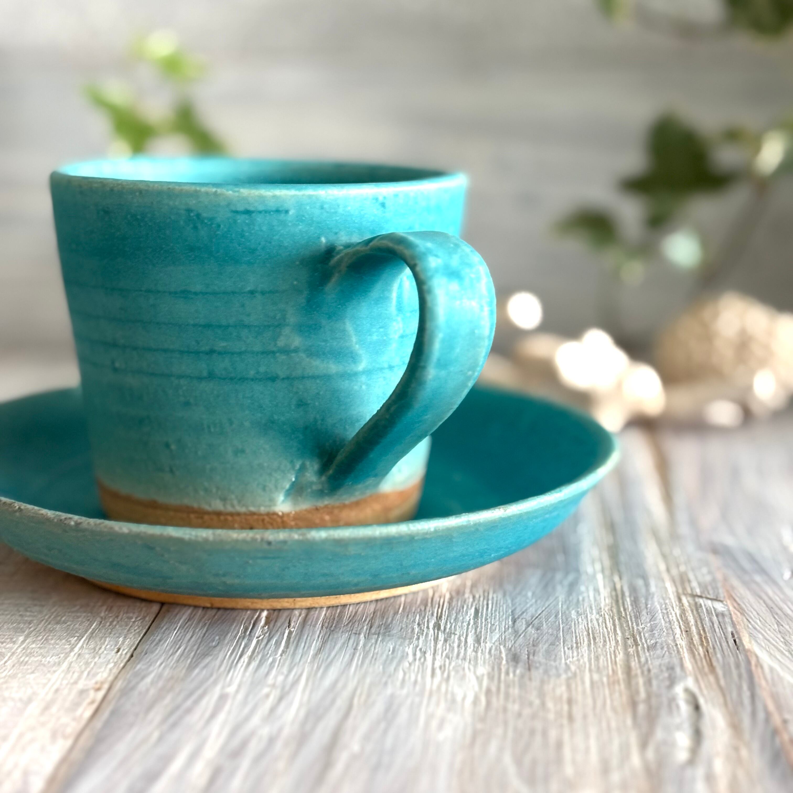 色鮮やかなマットのトルコブルーが特徴のマグカップとソーサーです。