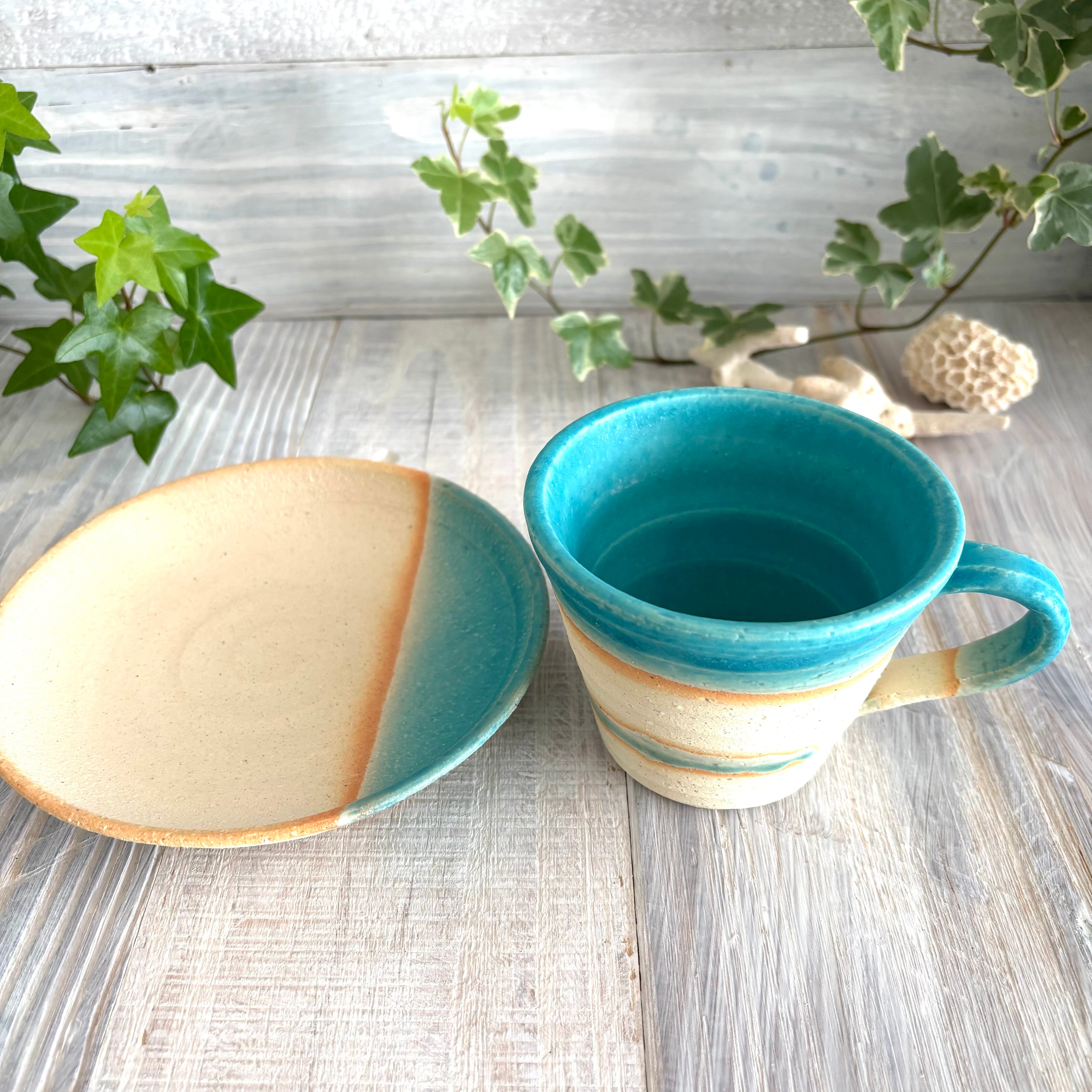 色鮮やかなマットのトルコブルーと素焼きの様なウェーブ柄が特徴のマグカップとソーサーです。