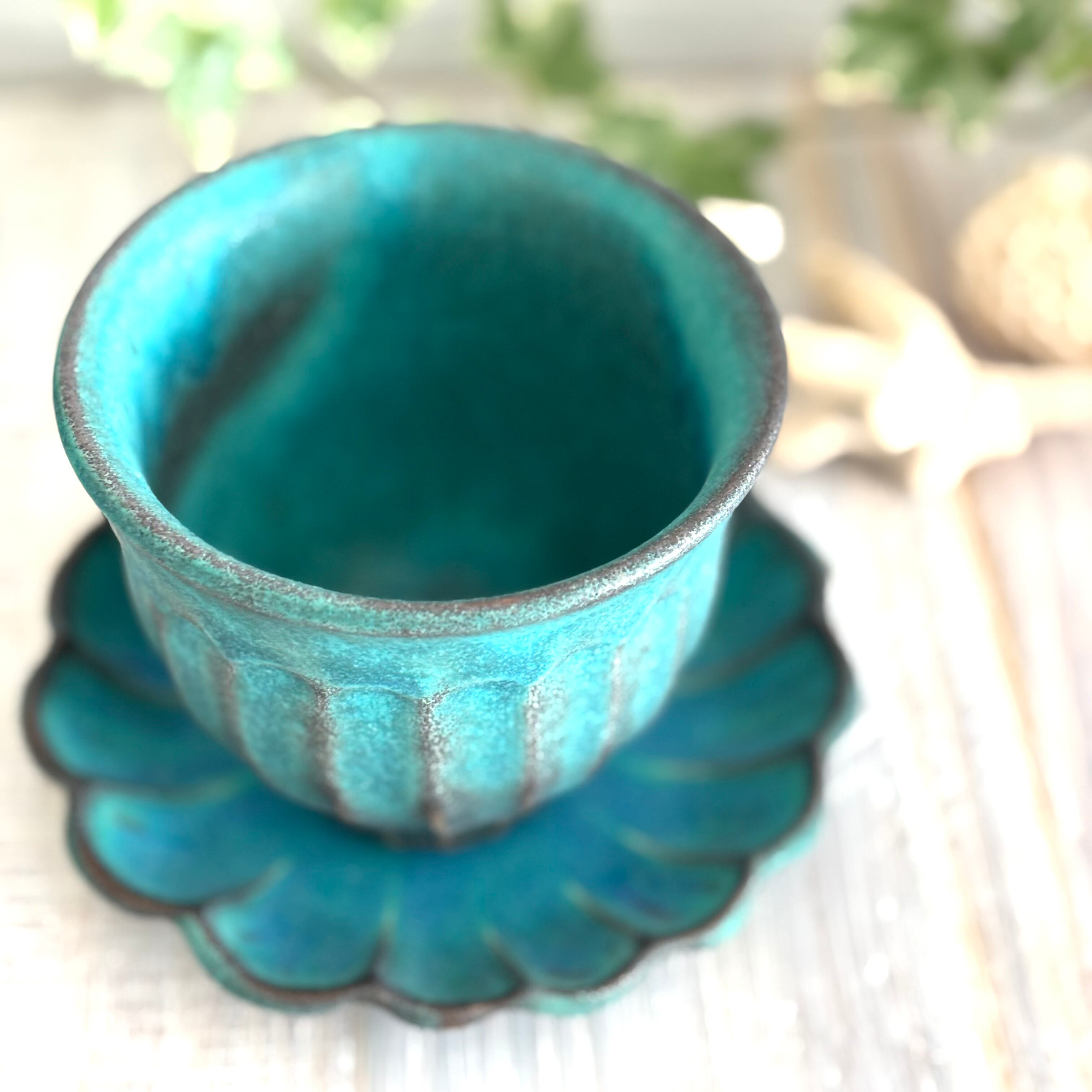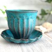 美しいターコイズブルーの色合いが人気の益子焼のシャビーターコイズシリーズ。ちょうど良いサイズのフリーカップです。湯のみが持ちやすくなるよう「しのぎ」の縦線模様を入れました。釉薬の自然な流れや色ムラによるシャビーシックな風合いが魅力。