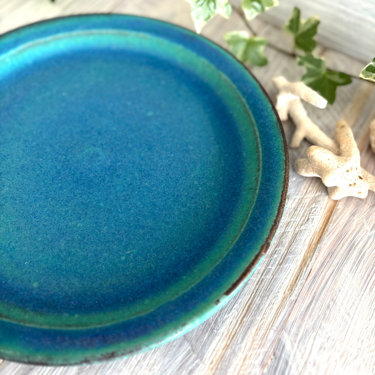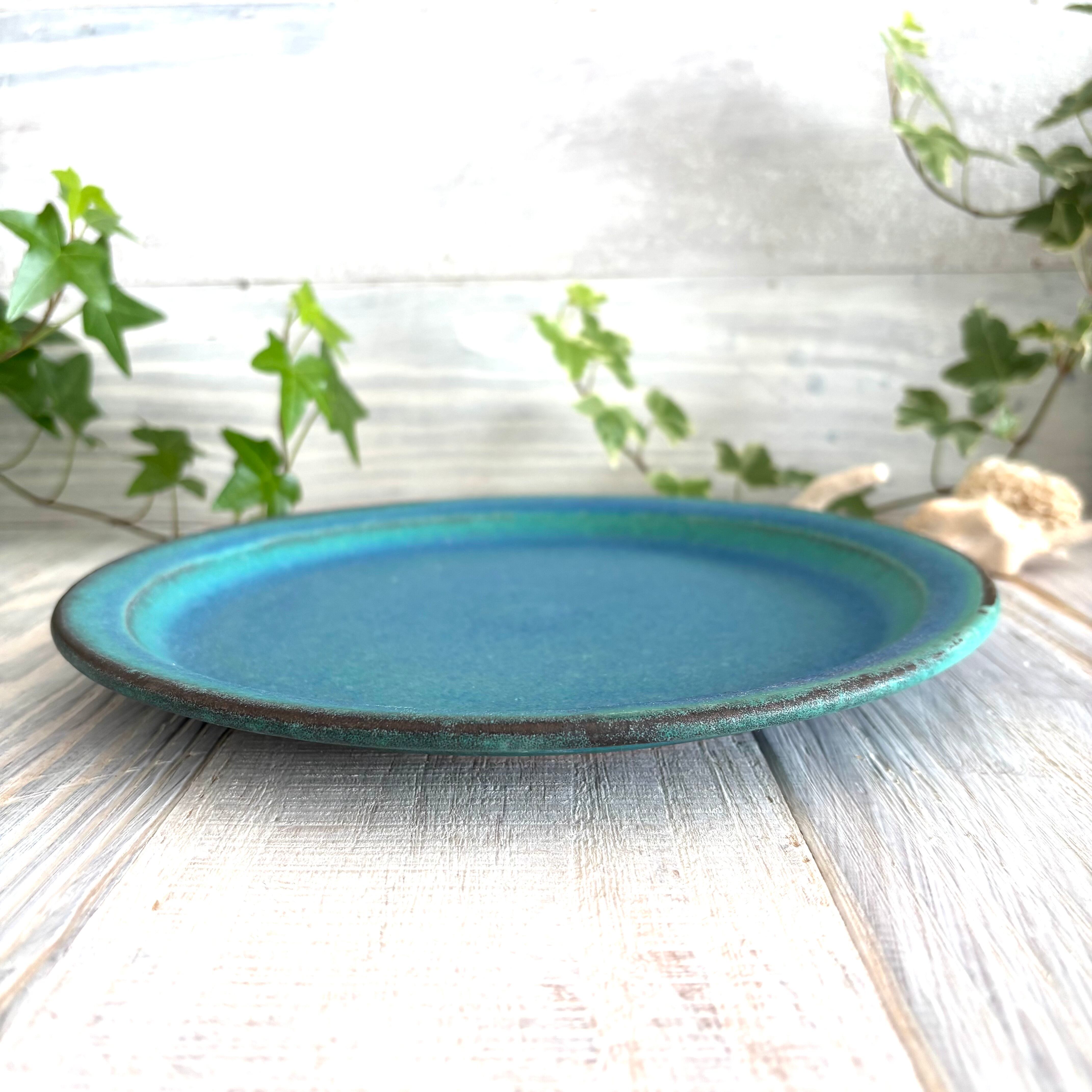美しいターコイズブルーの色合いが人気の「シャビーターコイズプレートL」。約23cm。メインディッシュやワンプレート料理の盛り付けに最適なサイズです。ベーシックな形状が普段使いしやすく、どんな料理にもマッチします。和食洋食はもちろん、アジアン料理やエスニック料理にも合うおしゃれなプレートです。モーニングからディナーまでオールマイティーにお使いいただけます。