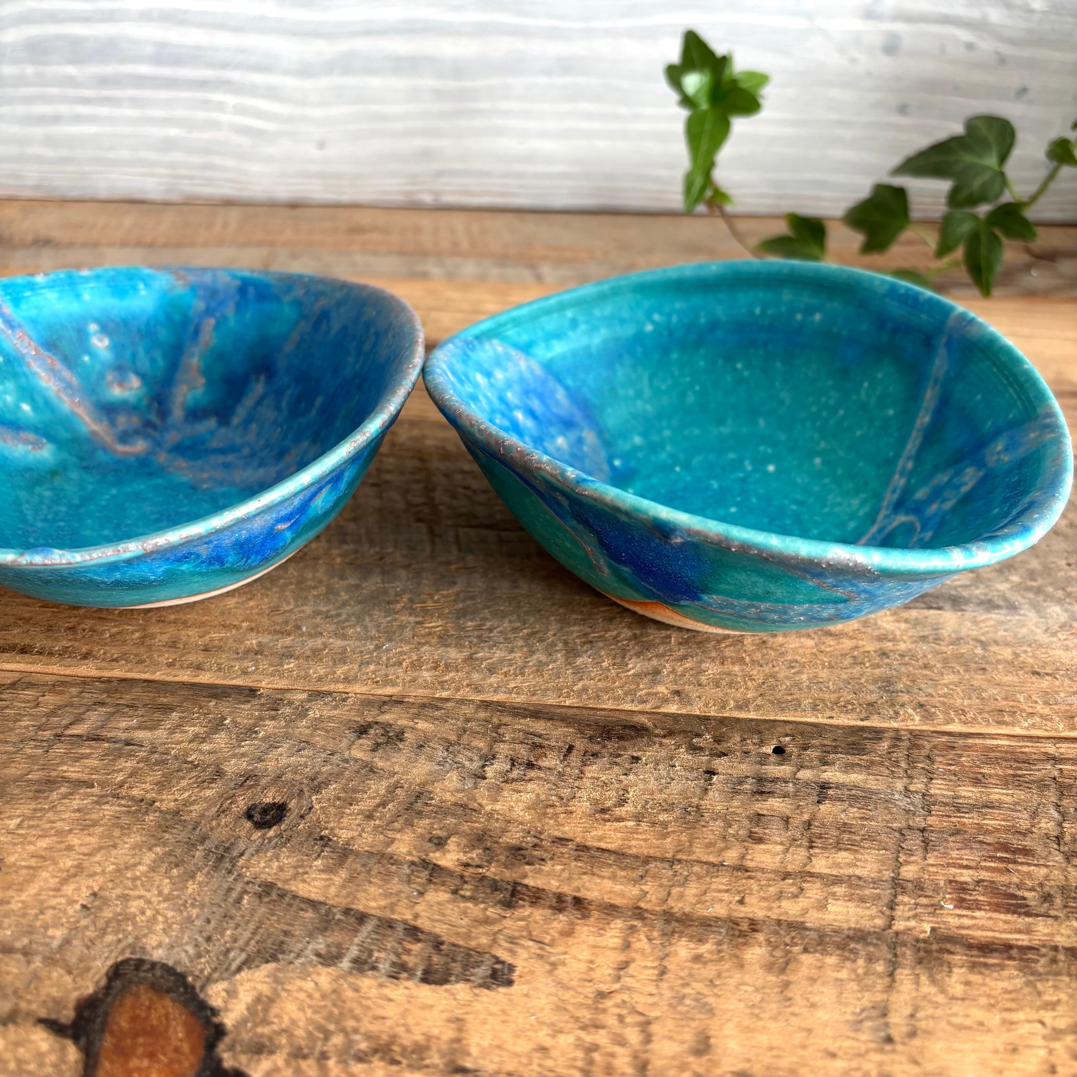 色鮮やかなトルコブルーがランダムに入った露草シリーズの小鉢です。冷奴や煮物などの和食やミニサラダボウルなどとしても、使い勝手の良い小鉢です。