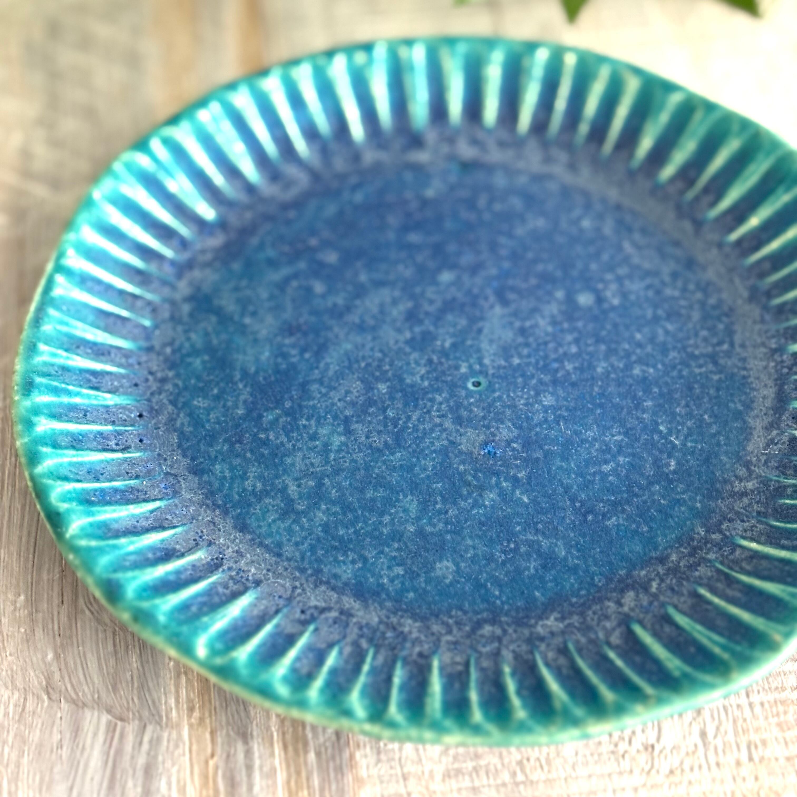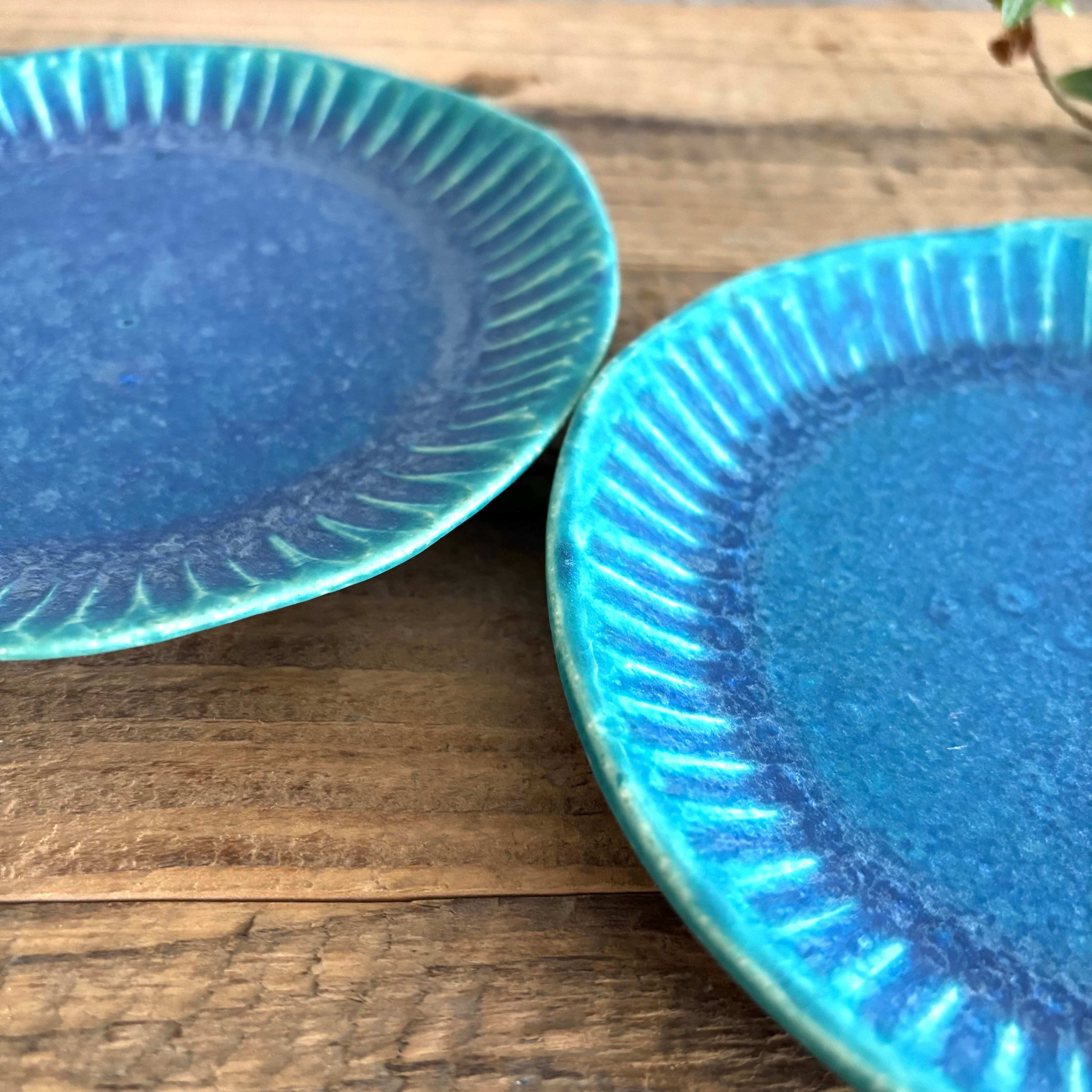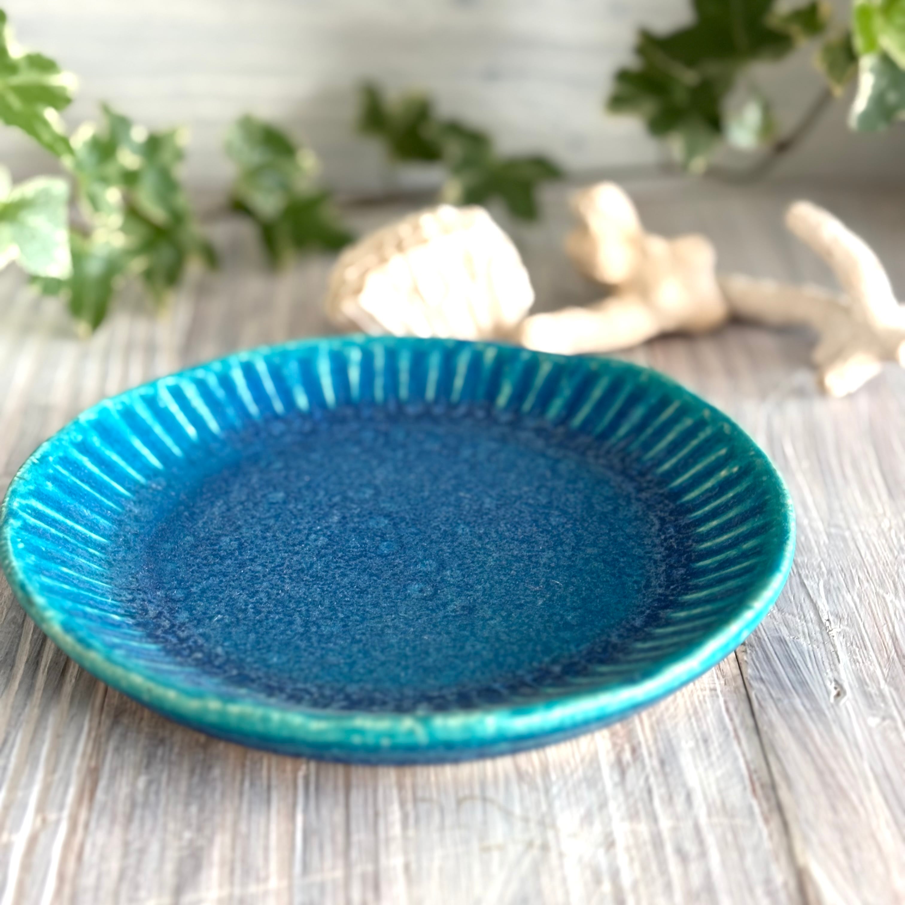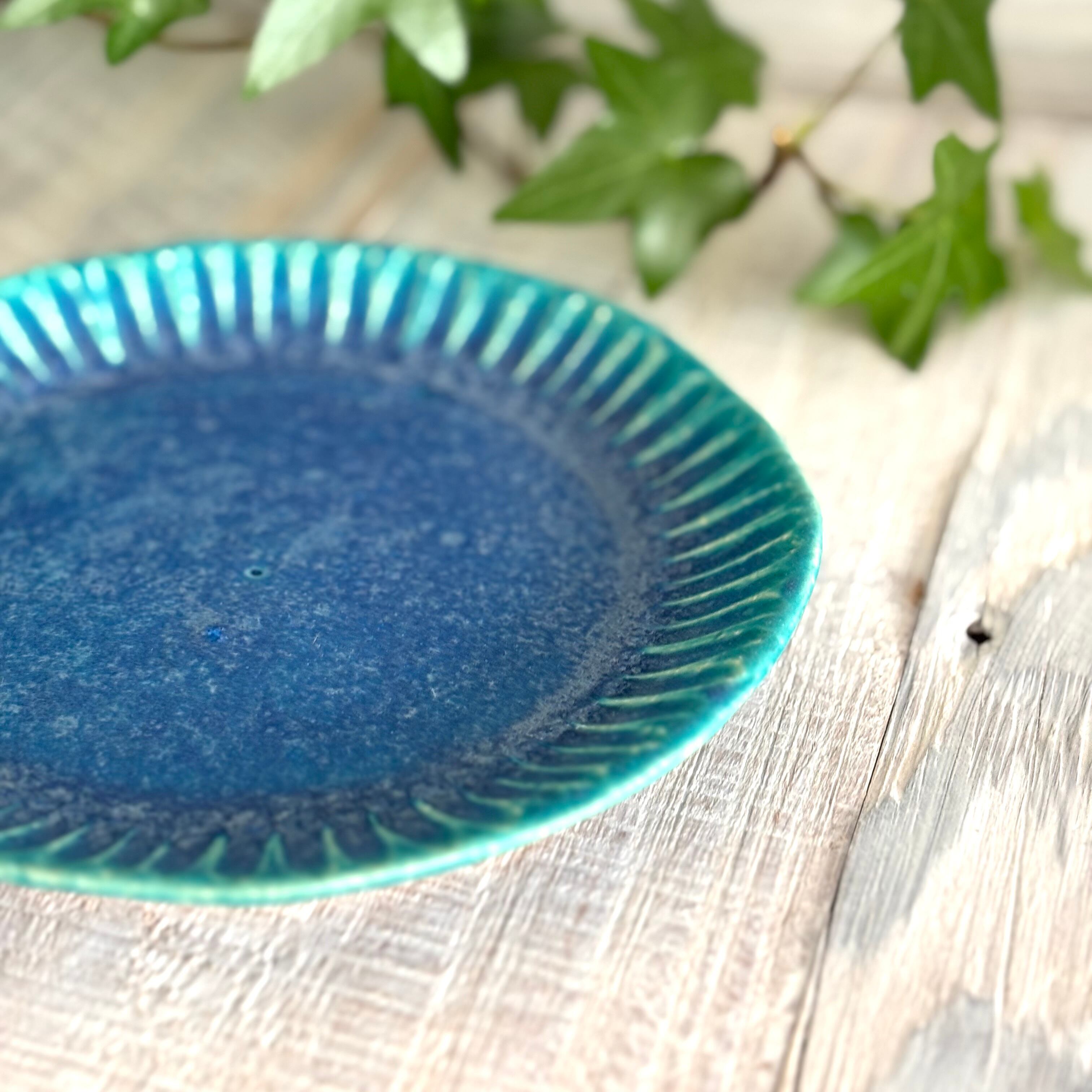 青味の濃いターコイズブルーの色合いが人気の信楽焼のターコイズシリーズです。色鮮やかなターコイズブルーのプレートは四季を問わずお使い頂けます。とにかく頻繁に使うサイズで、日常使いはもちろん来客時のお菓子皿としても最適。鎬(しのぎ)模様を施したリムのあるシンプルなかたち。不揃いの歪みも特徴です。25cmプレートの取り皿としてお薦めです。