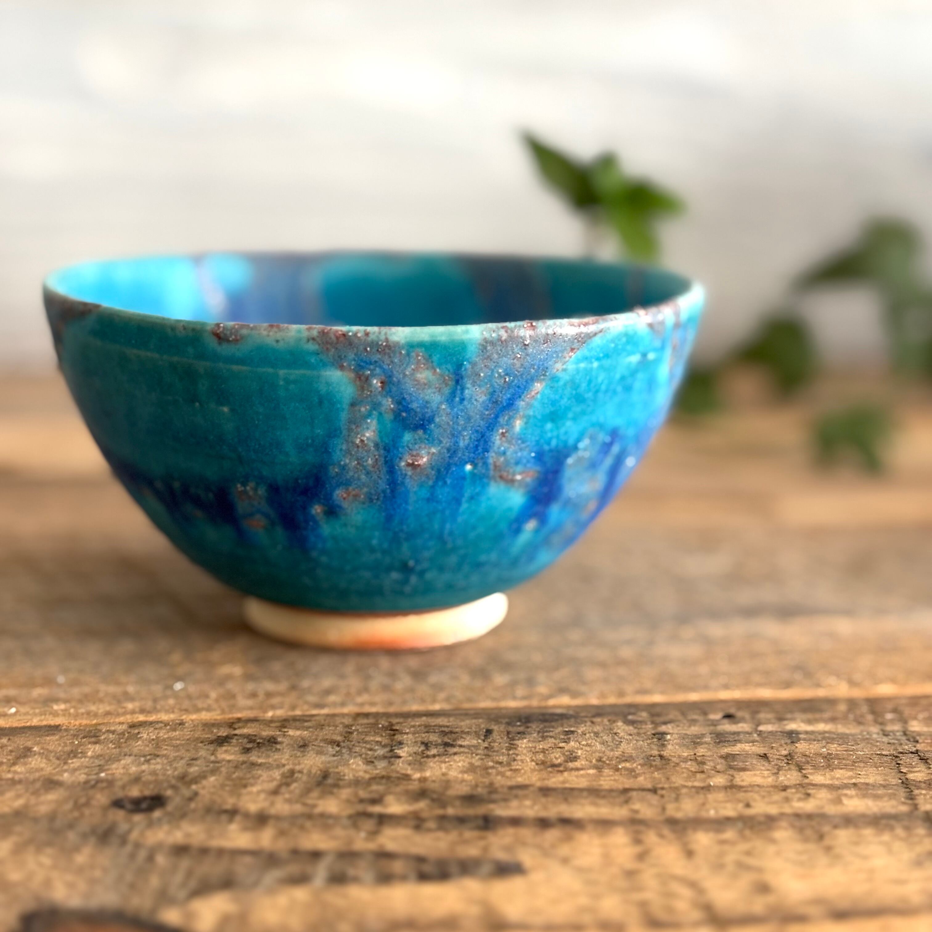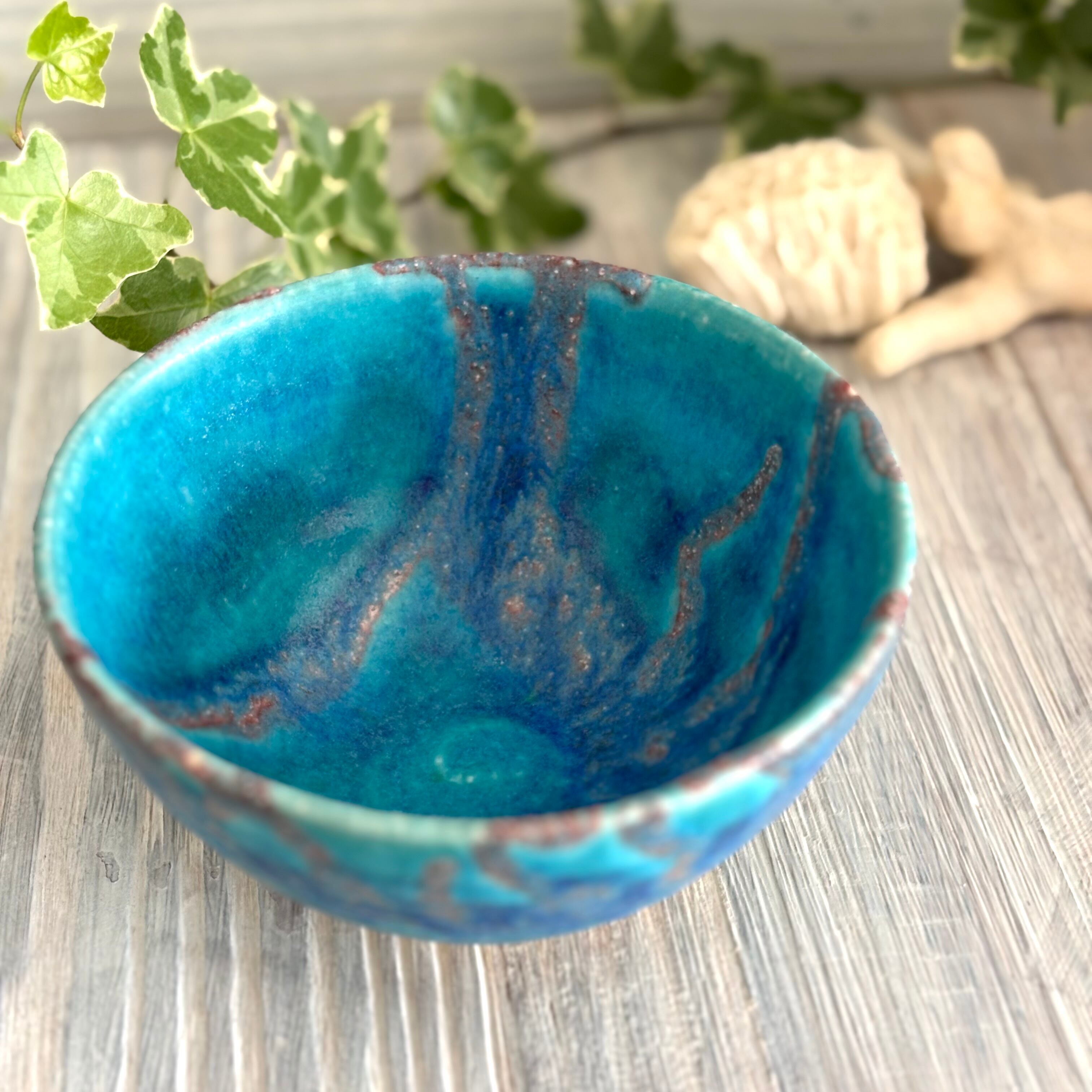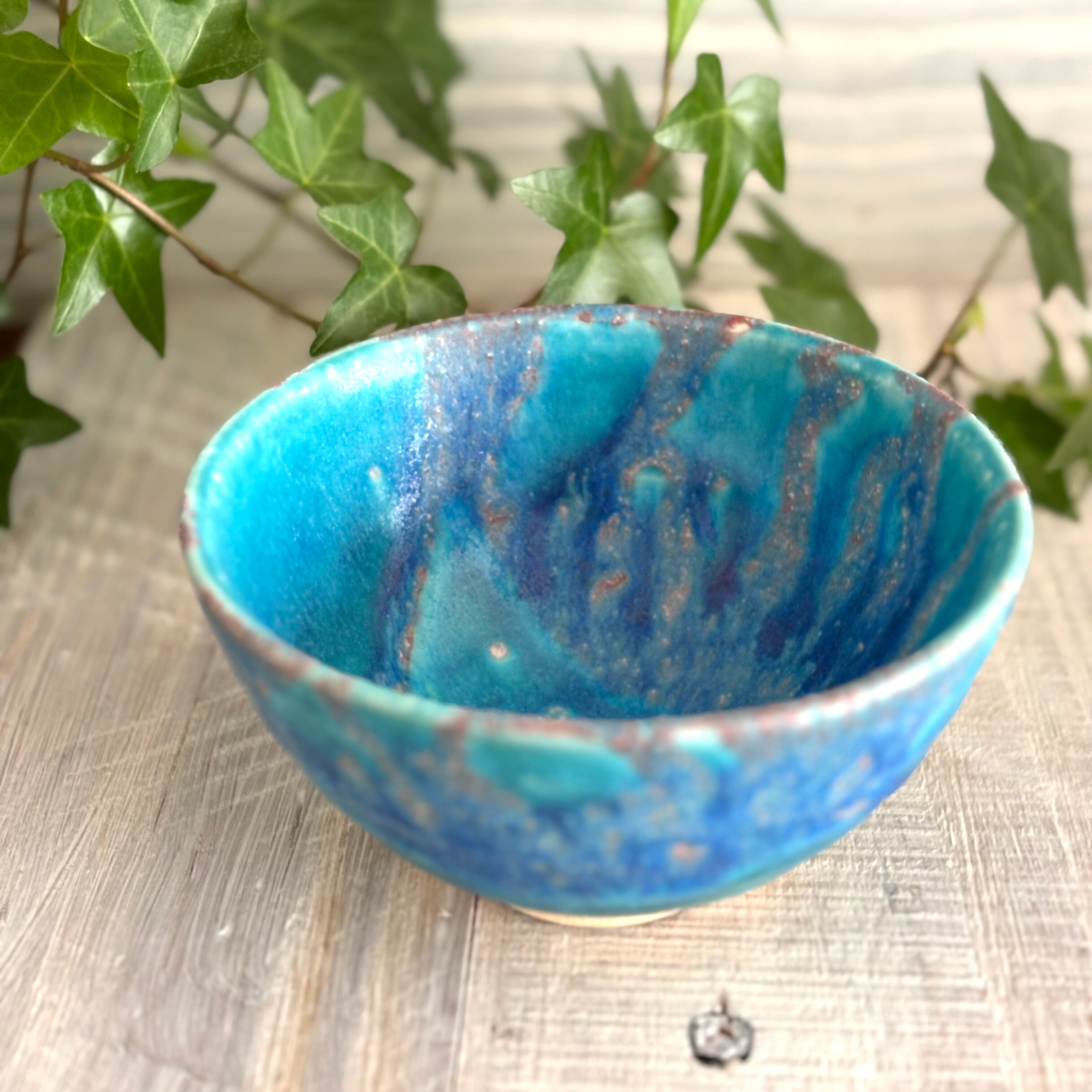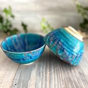 色鮮やかなトルコブルーがランダムに入った露草シリーズの飯碗の小サイズ。氷河シリーズとのペアも非常に人気です。「信楽焼」は、滋賀県甲賀市信楽町でつくられているやきもの。日本六古窯の一つと数えられ、1260年もの永い歴史があるといわれています。 1976年(昭和51年)に国から伝統的工芸品の指定を受けています。