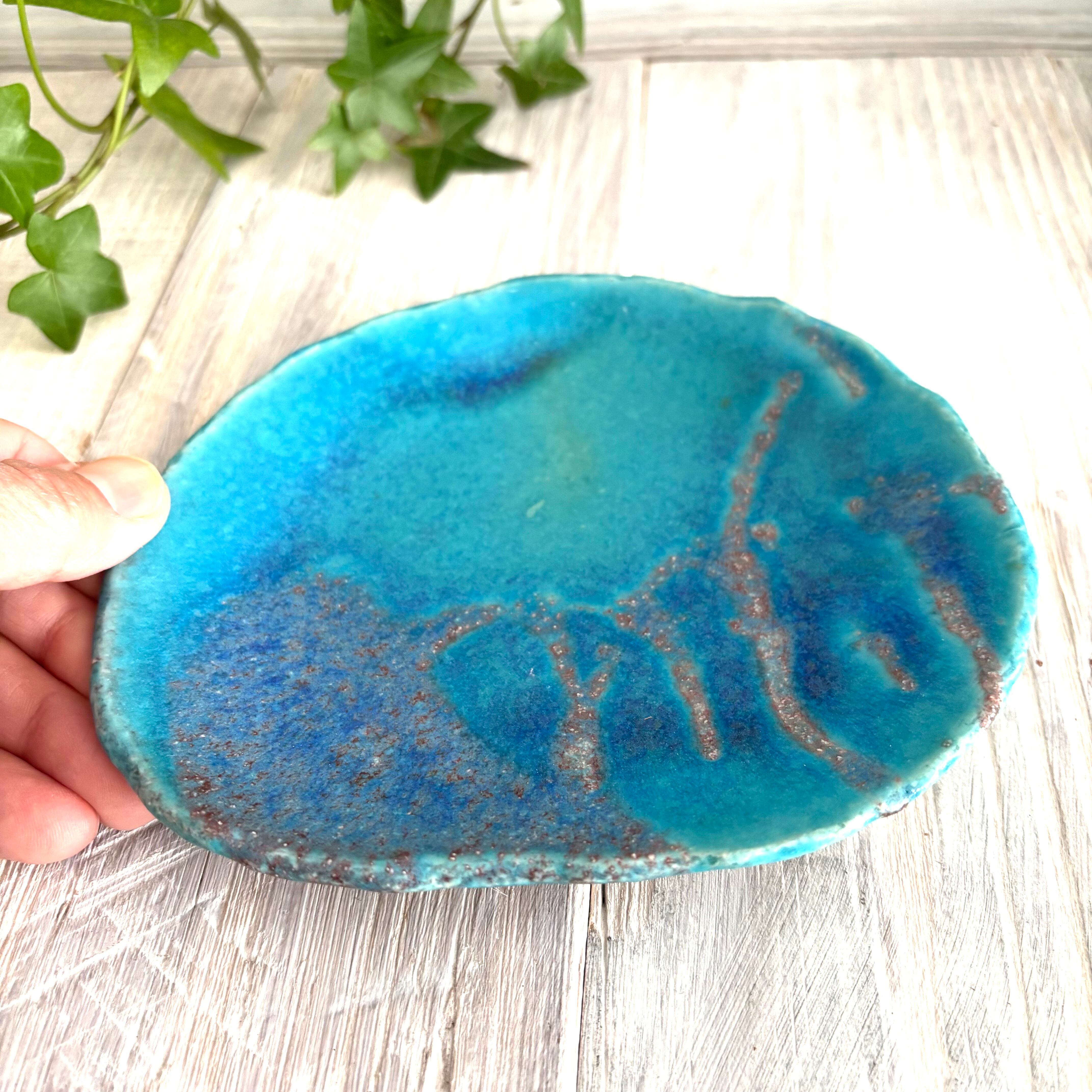 色鮮やかなトルコブルーがランダムに入った露草シリーズのたたら皿です。アシンメトリーな形のかわいいお皿。「信楽焼」は、滋賀県甲賀市信楽町でつくられているやきもの。日本六古窯の一つと数えられ、1260年もの永い歴史があるといわれています。 1976年(昭和51年)に国から伝統的工芸品の指定を受けています。