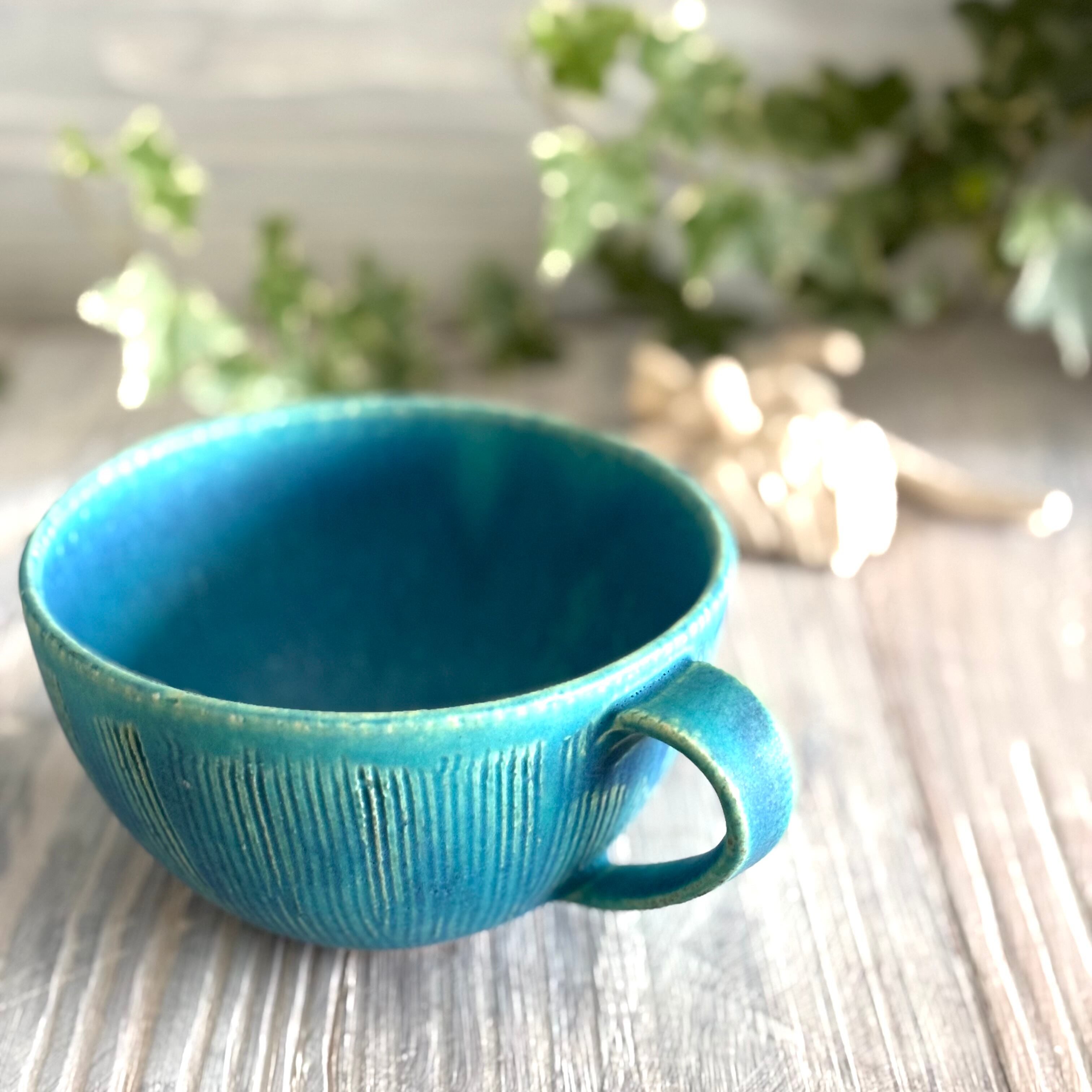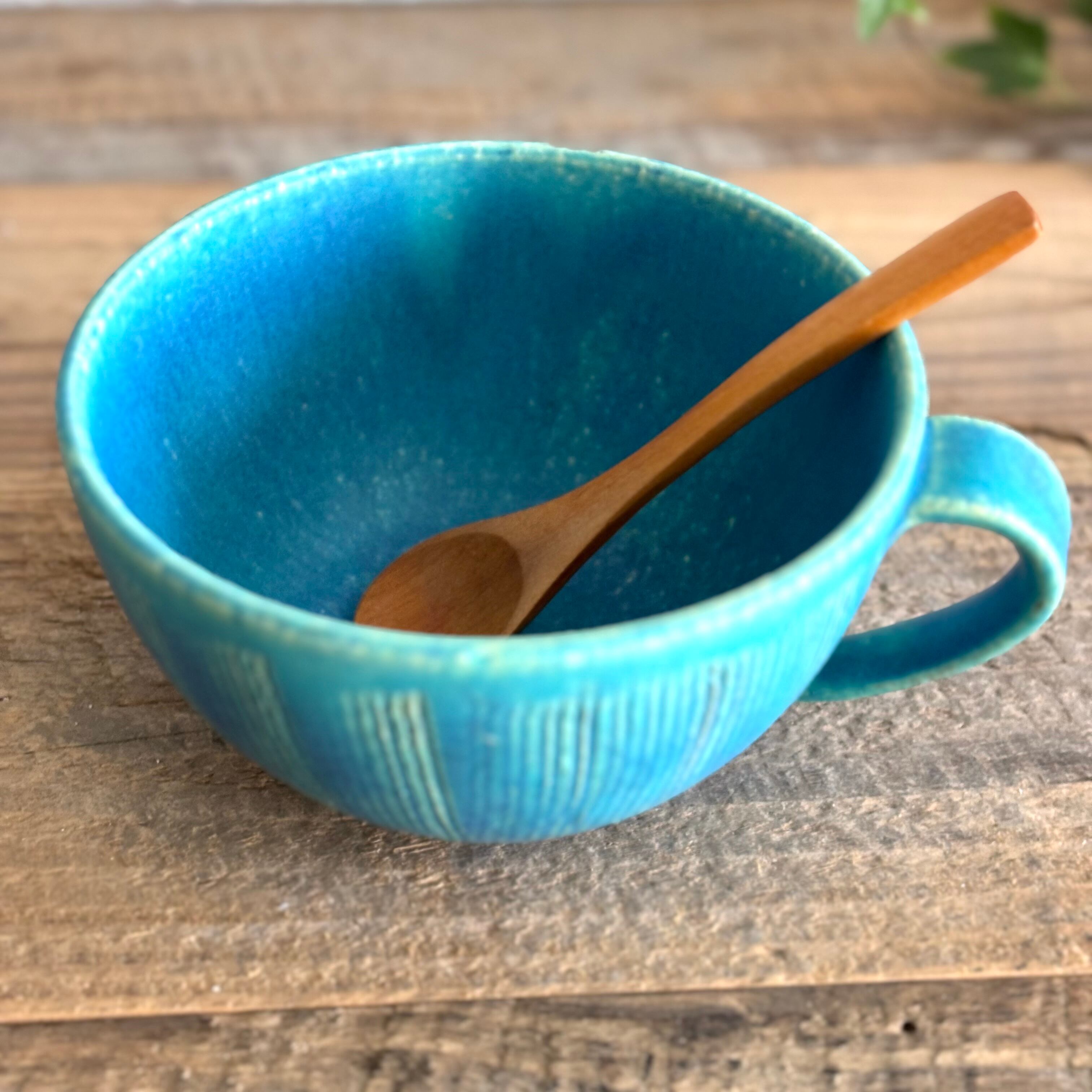 色鮮やかなマットなトルコブルーカラーに表面にくし目がついたスープカップ。「信楽焼」は、滋賀県甲賀市信楽町でつくられているやきもの。日本六古窯の一つと数えられ、1260年もの永い歴史があるといわれています。 1976年(昭和51年)に国から伝統的工芸品の指定を受けています。