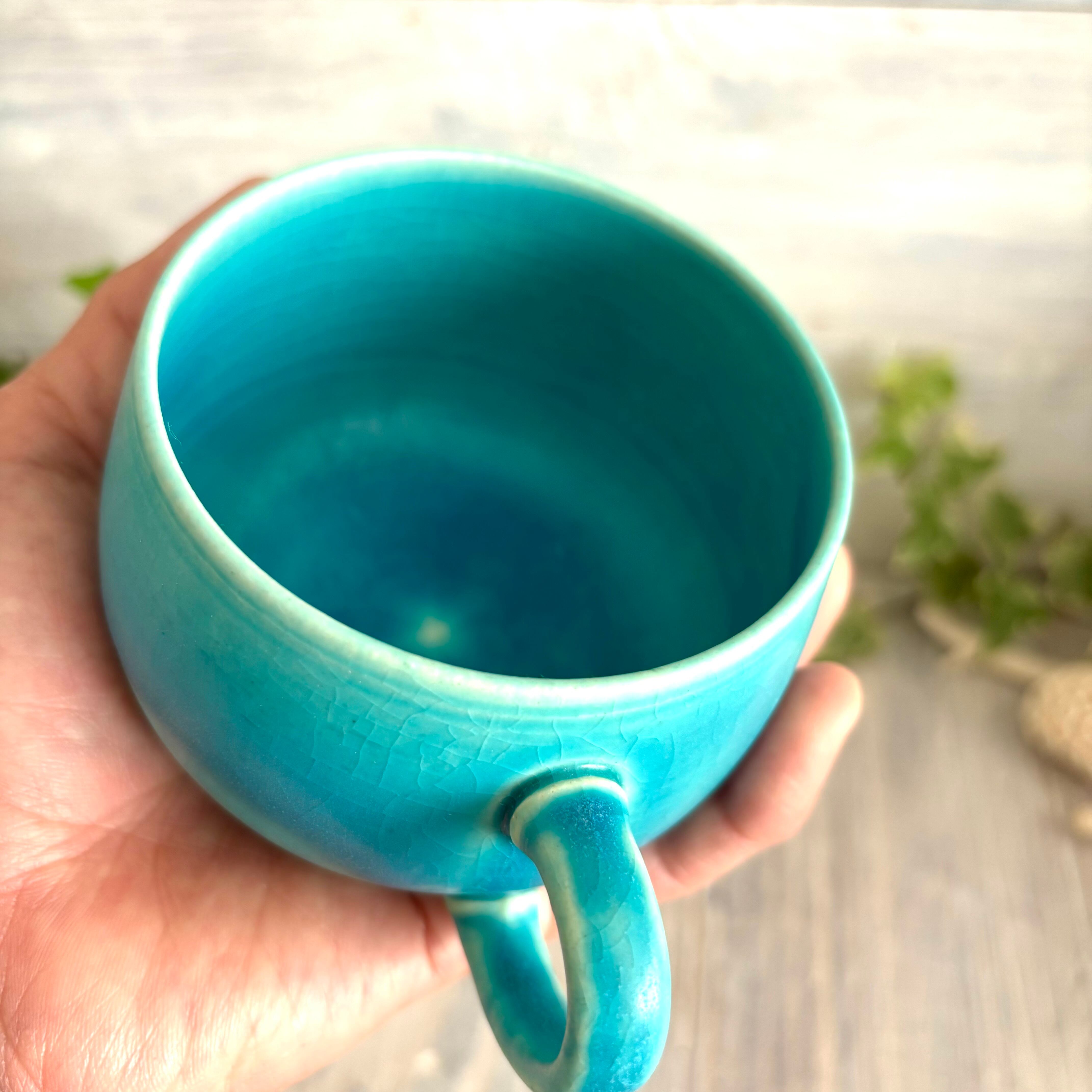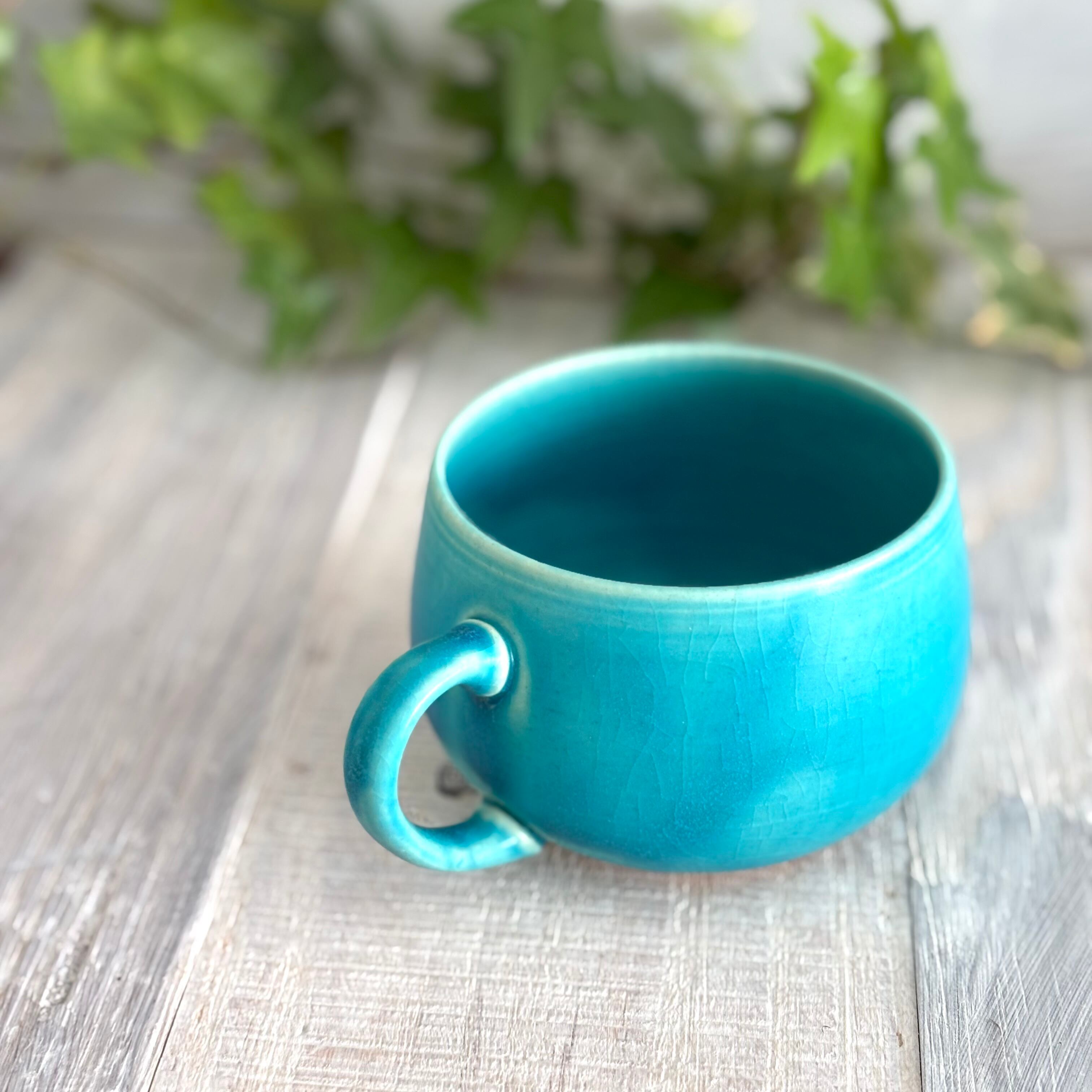 色鮮やかなトルコブルーが目を引くスープカップです。繊細に作られたカップはとても軽く、手のひらに馴染みます。釉薬のグラデーションとランダムに入った貫入が美しいカップです。