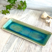 ターコイズの釉薬をランダムに使いモダンなテイストにアレンジしています。器の中にガラスを入れて焼き上げていますので、溶けたガラスが鮮やかな印象を与えます。盛り付けが美しく決まるオーバルプレート。