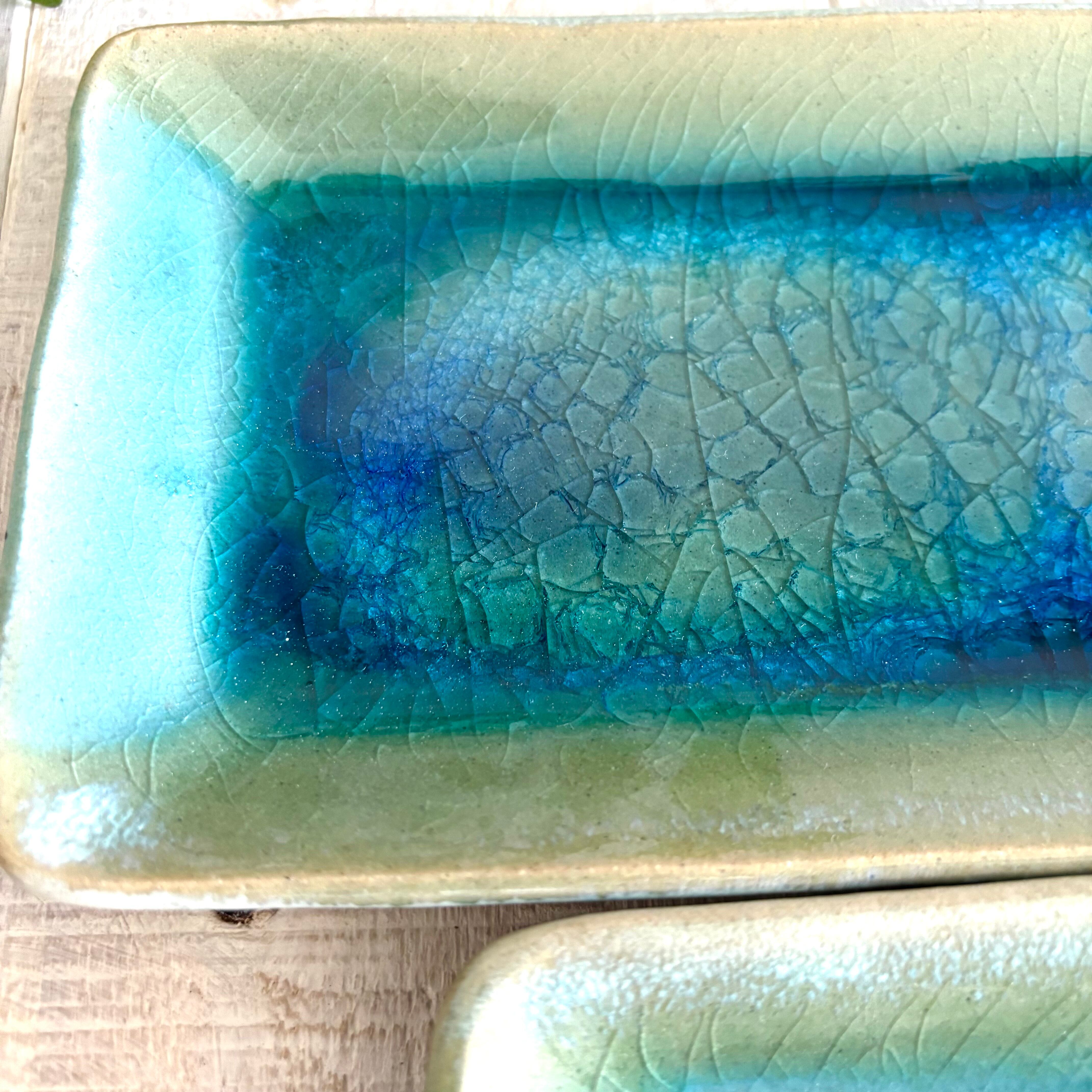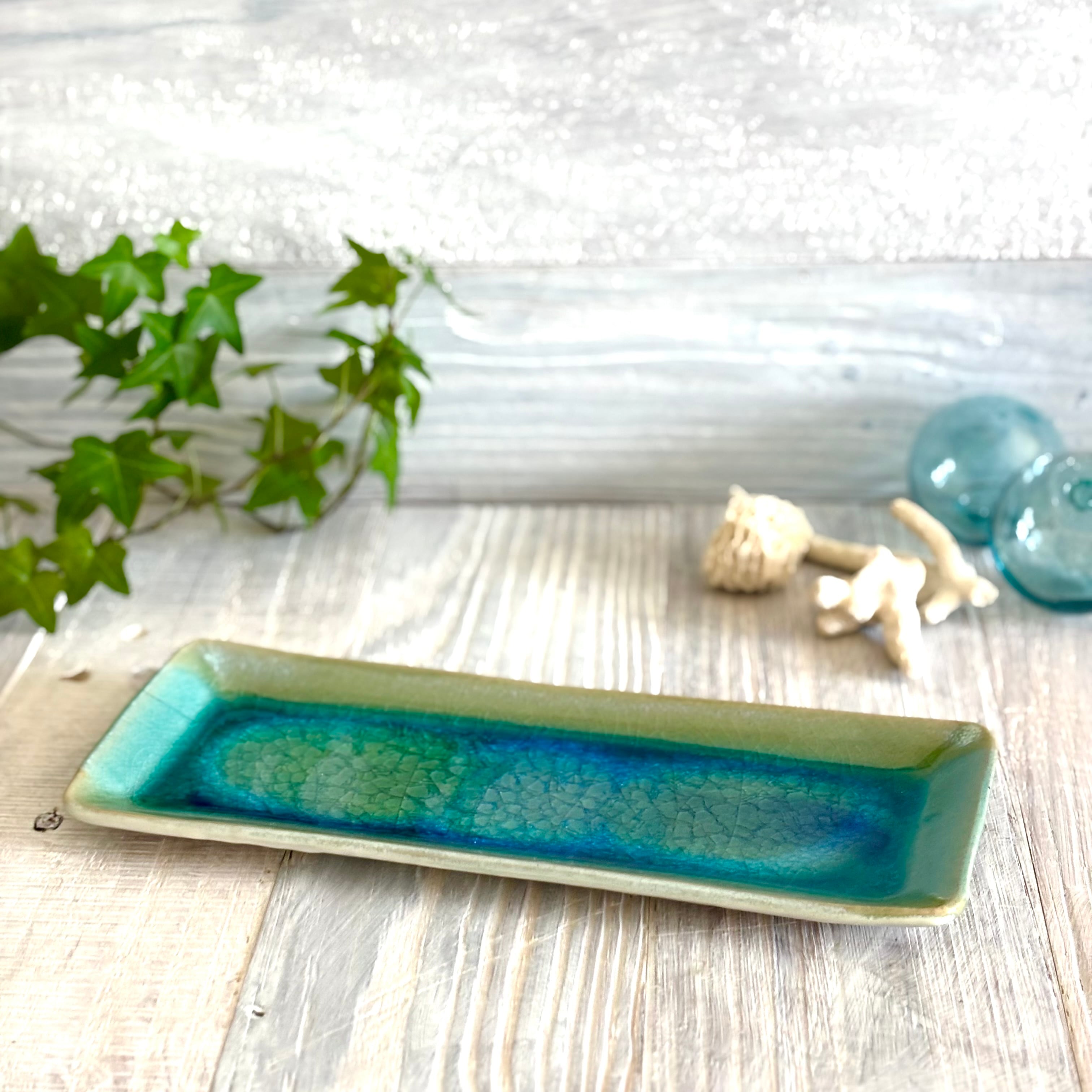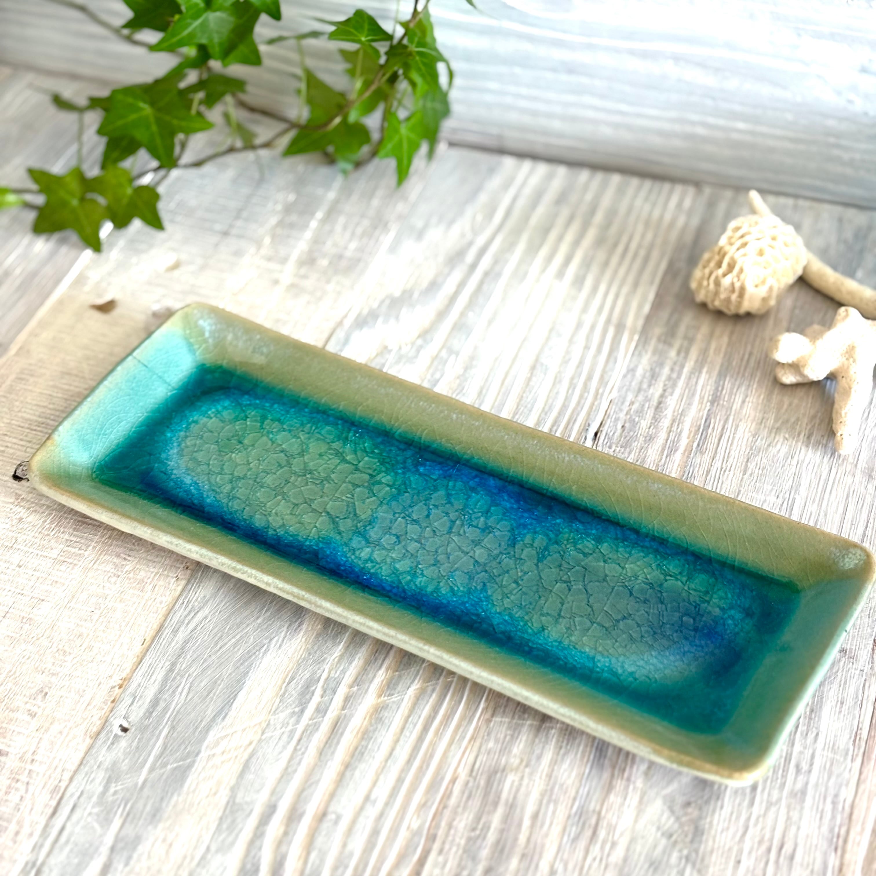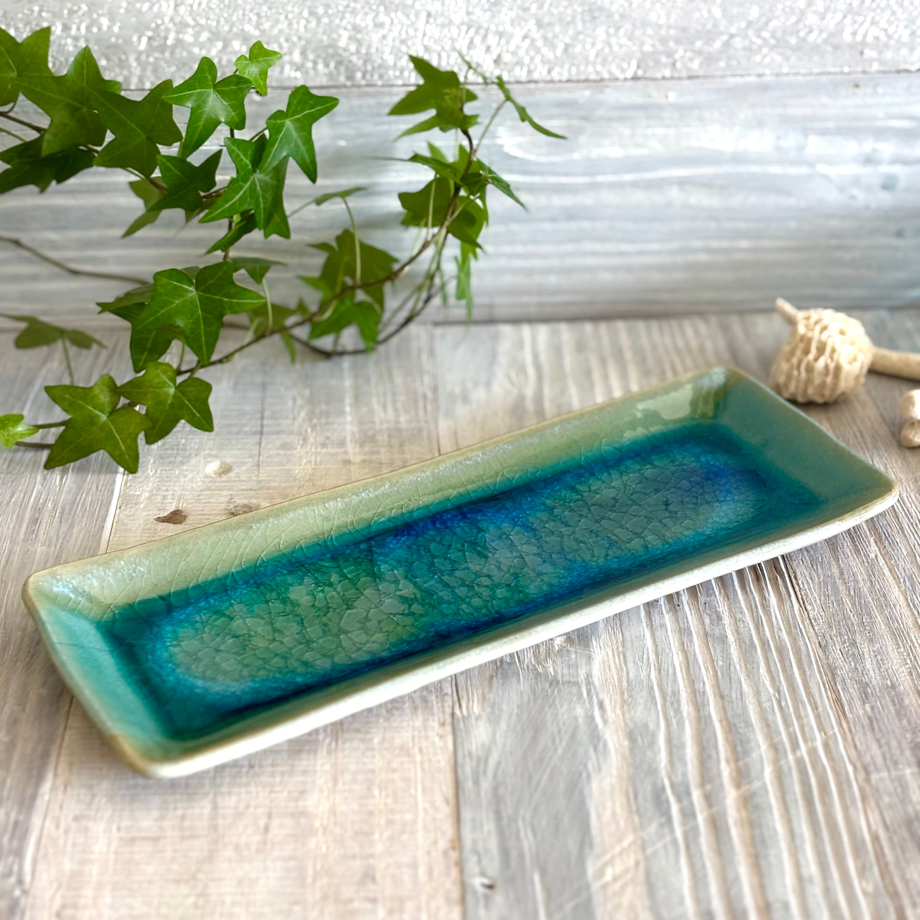 美しいターコイズブルーが食卓を華やかに彩ります。おつまみやオードブル、お寿司、お茶菓子用のお皿としてぜひどうぞ。