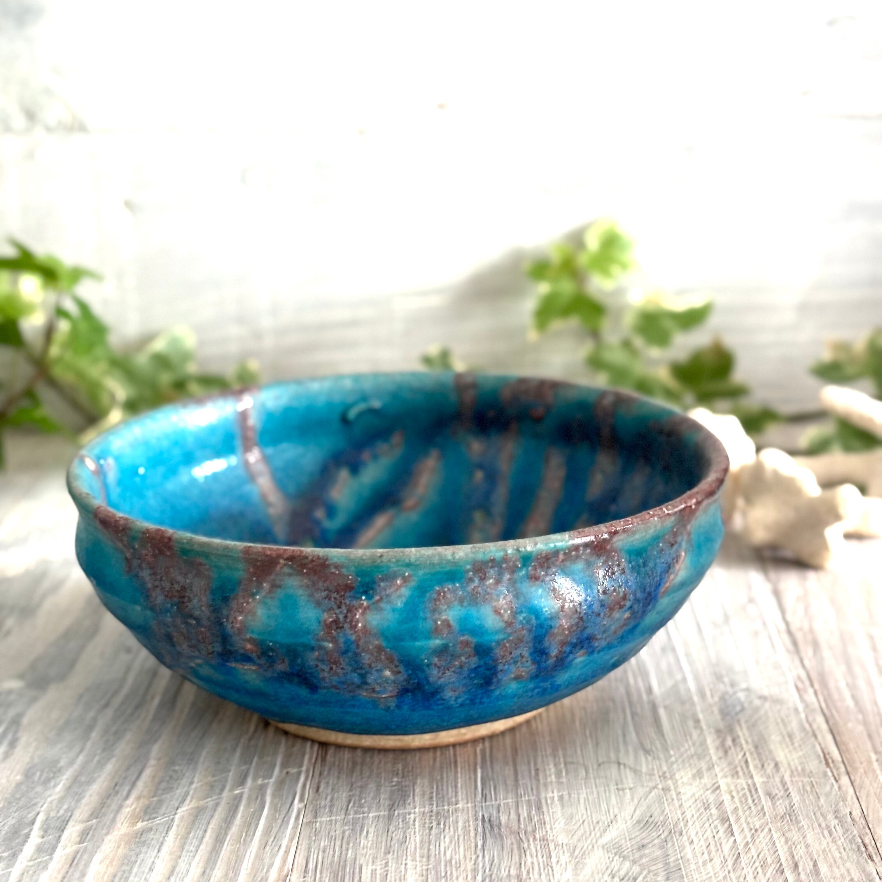 色鮮やかなトルコブルーがランダムに入った露草シリーズの丸鉢です。煮物の鉢にもサラダボウルにもぴったりです。「信楽焼」は、滋賀県甲賀市信楽町でつくられているやきもの。日本六古窯の一つと数えられ、1260年もの永い歴史があるといわれています。 1976年(昭和51年)に国から伝統的工芸品の指定を受けています。