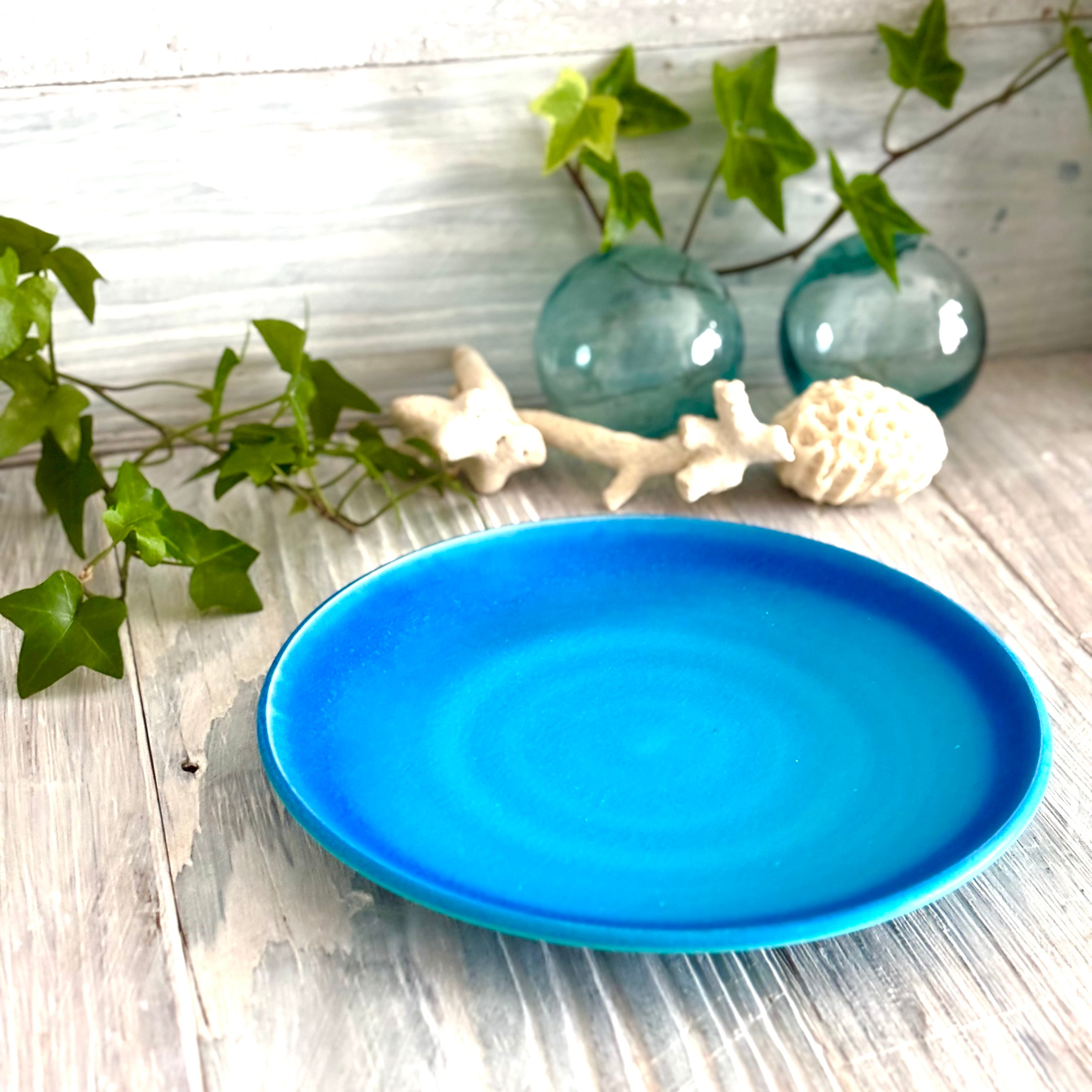 色鮮やかなマットのターコイズブルーのグラデーションと貫入釉薬が美しいプレートです。パン皿やケーキ皿などにもちょうどいいサイズのプレートです。爽やかなブルーが西海岸スタイル、サーファースタイル、ハワイアンスタイルによく馴染むプレートです。
