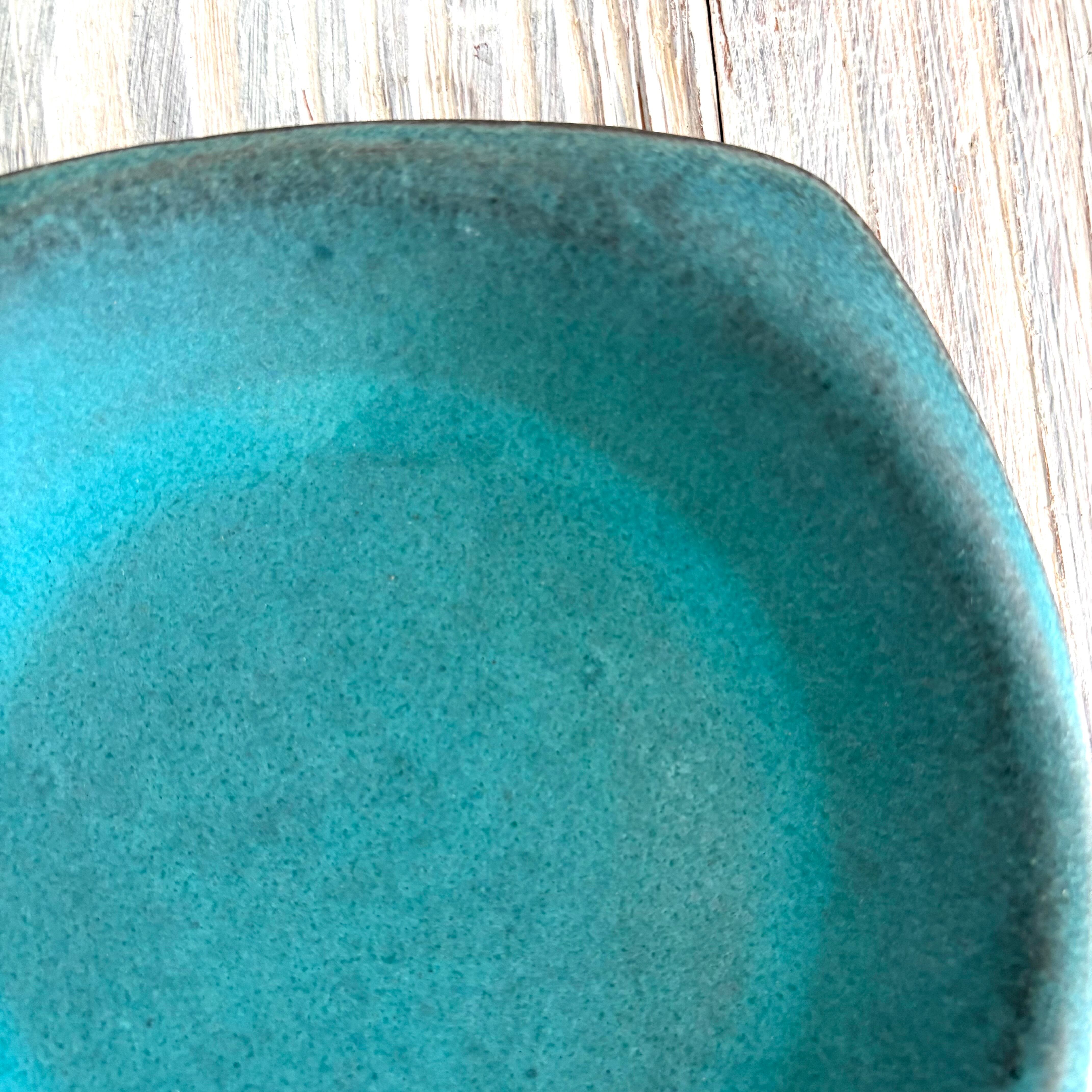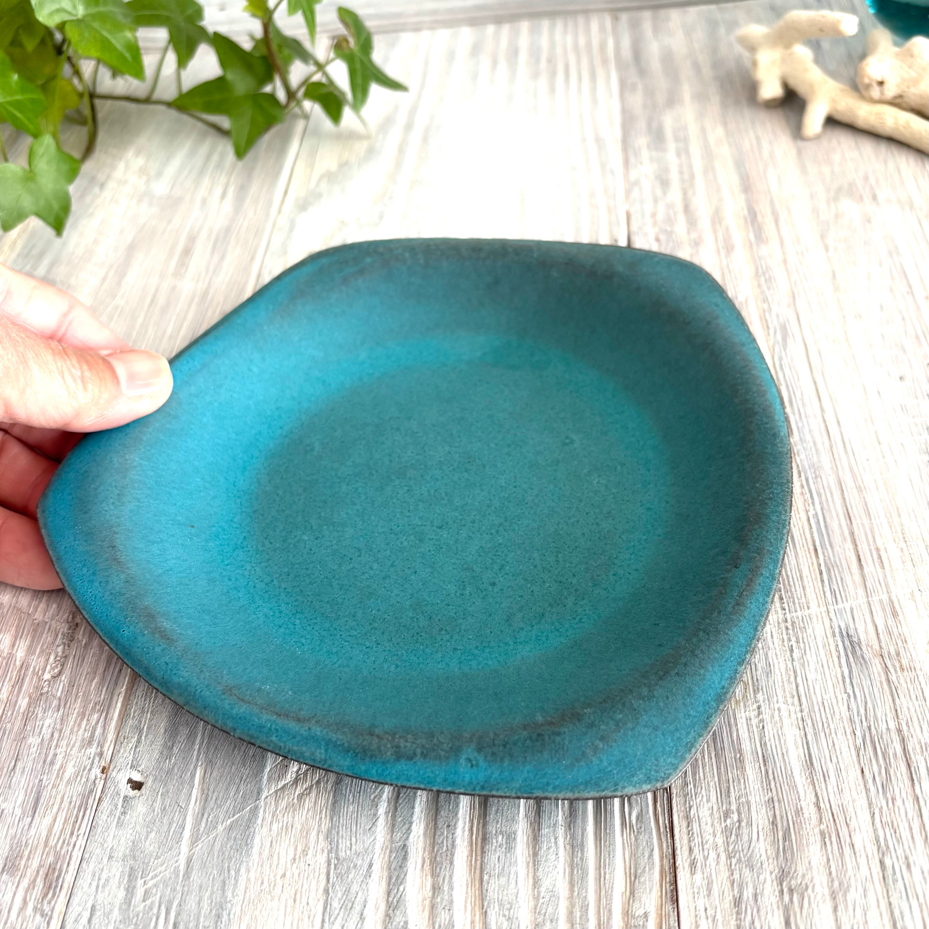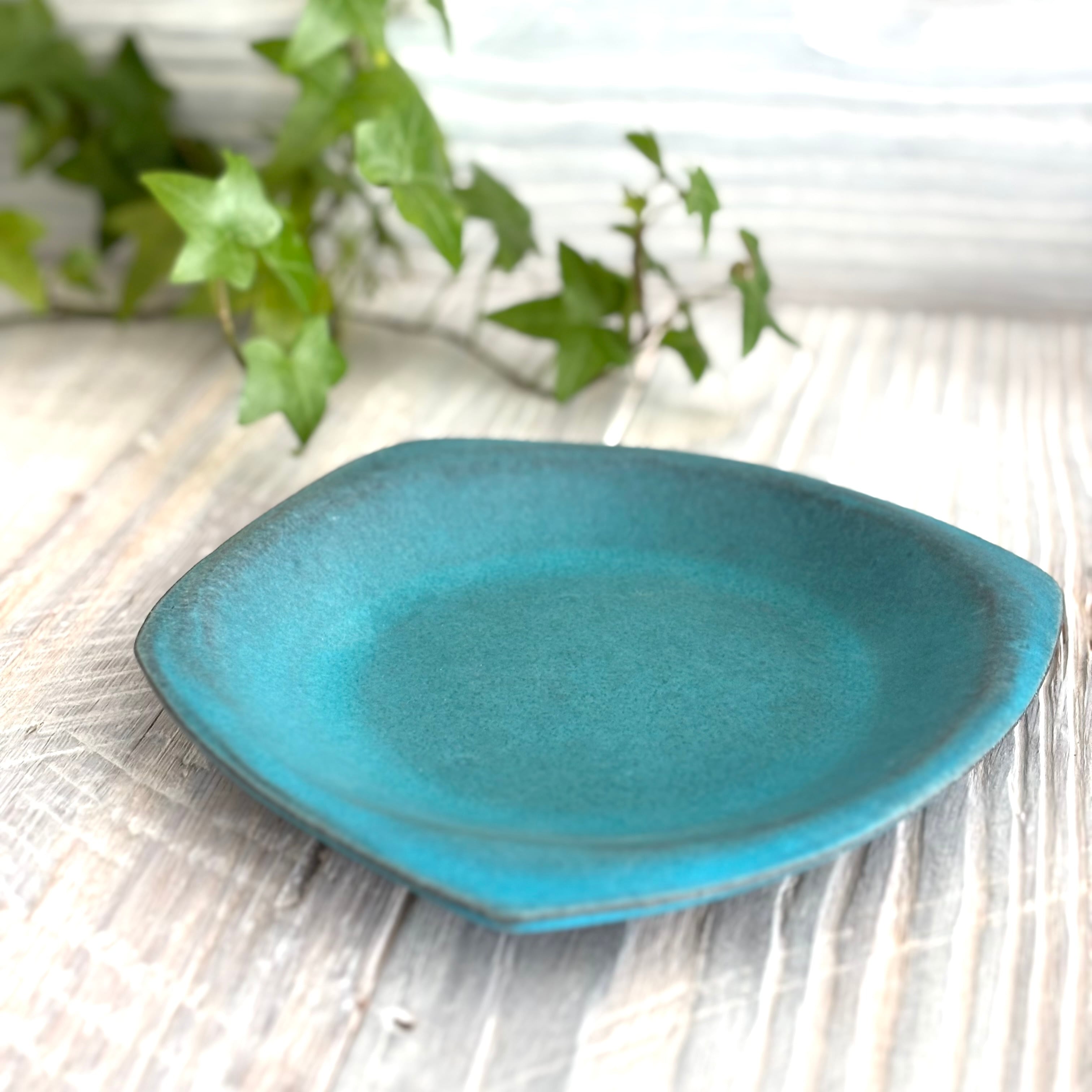 丹波篠山にある窯元からのターコイズブルーのランチプレートSです。ケーキ皿などの菓子皿として、パン皿や小さめのサラダプレートとしても使い勝手の良い器です。独特の変形デザインが魅力です。