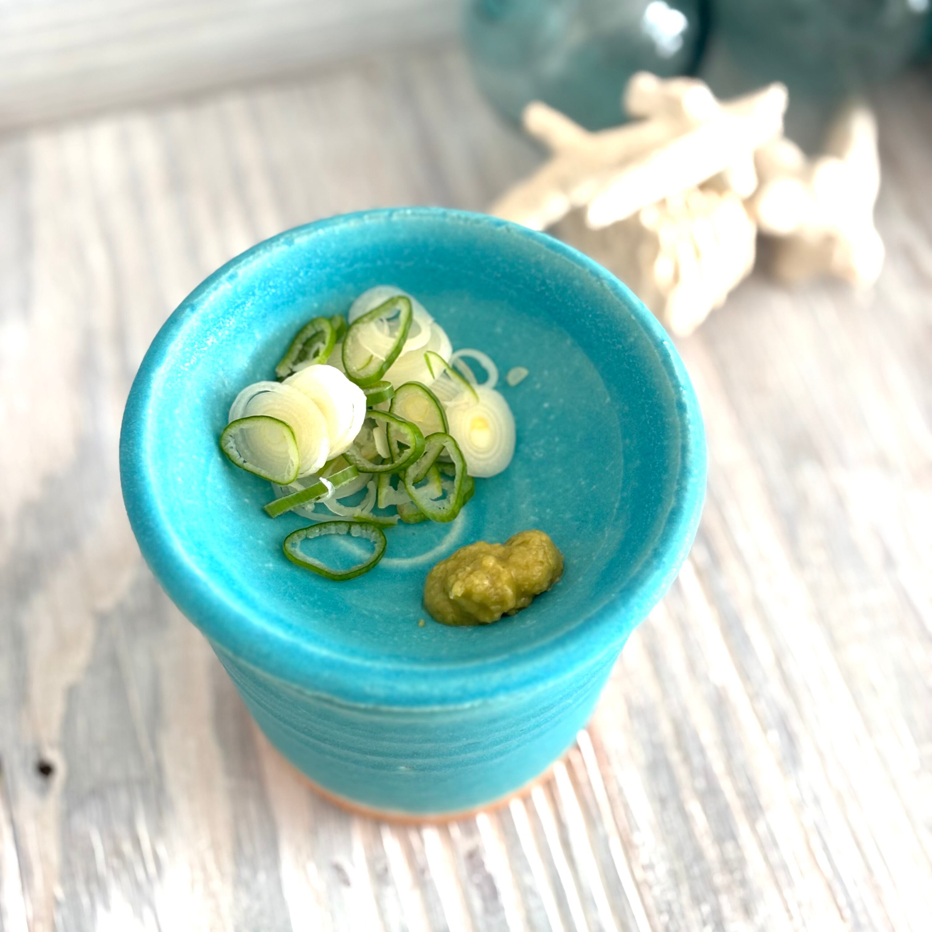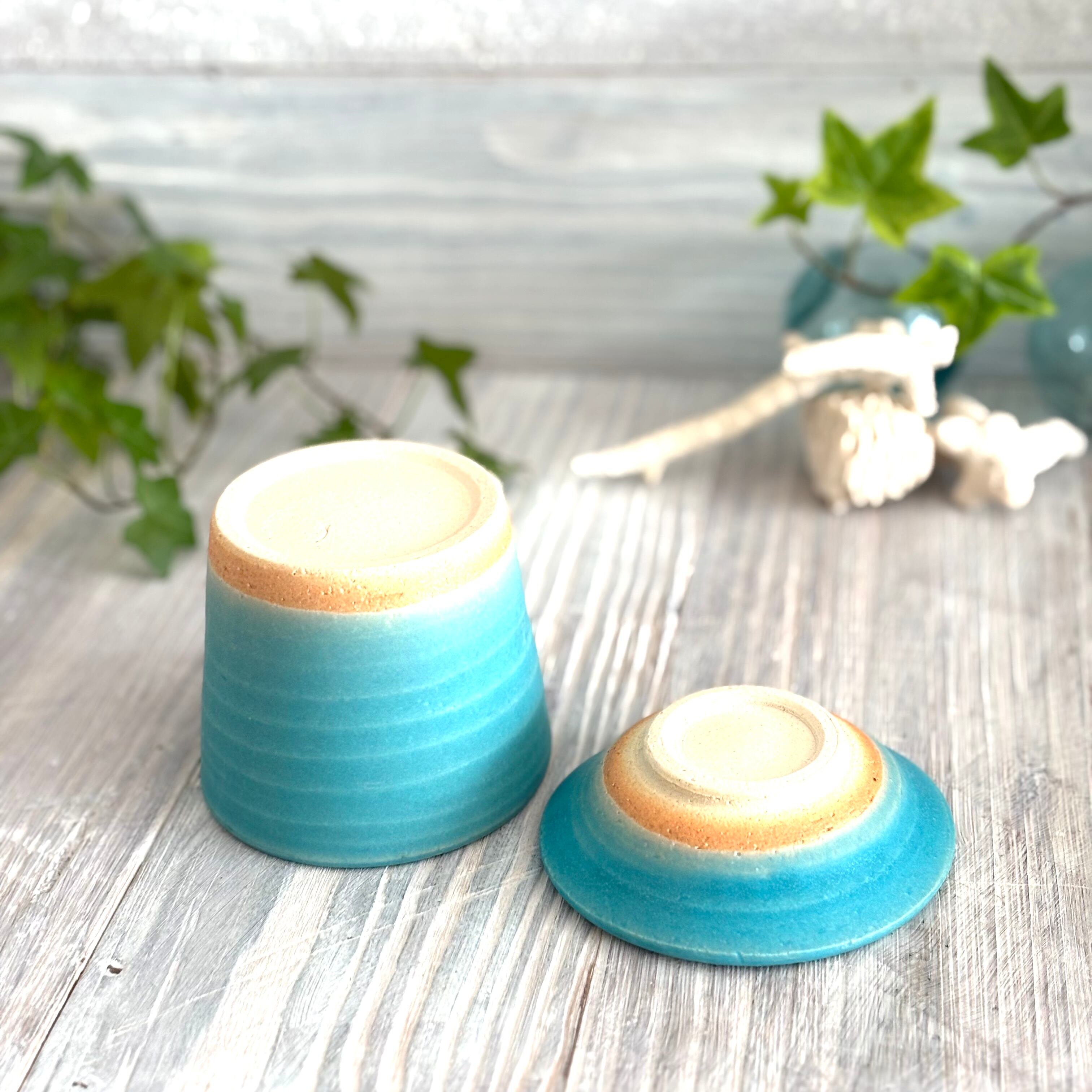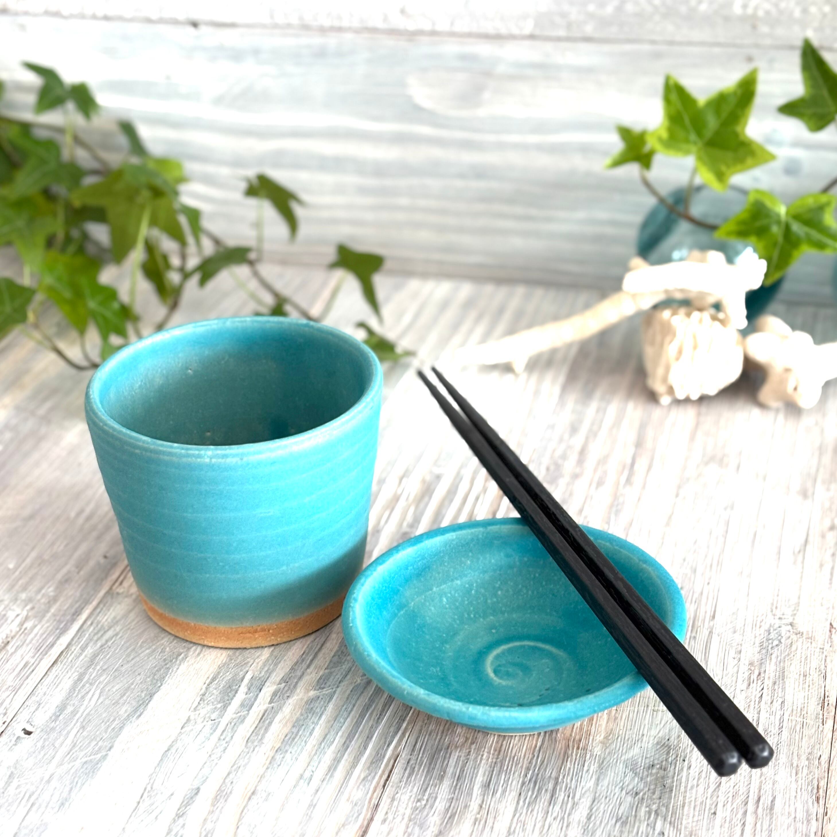 色鮮やかなマットのトルコブルーが特徴のそば猪口と薬味皿のセットです。湯呑みとお茶請けの小皿としても使い勝手が良いセットです。
