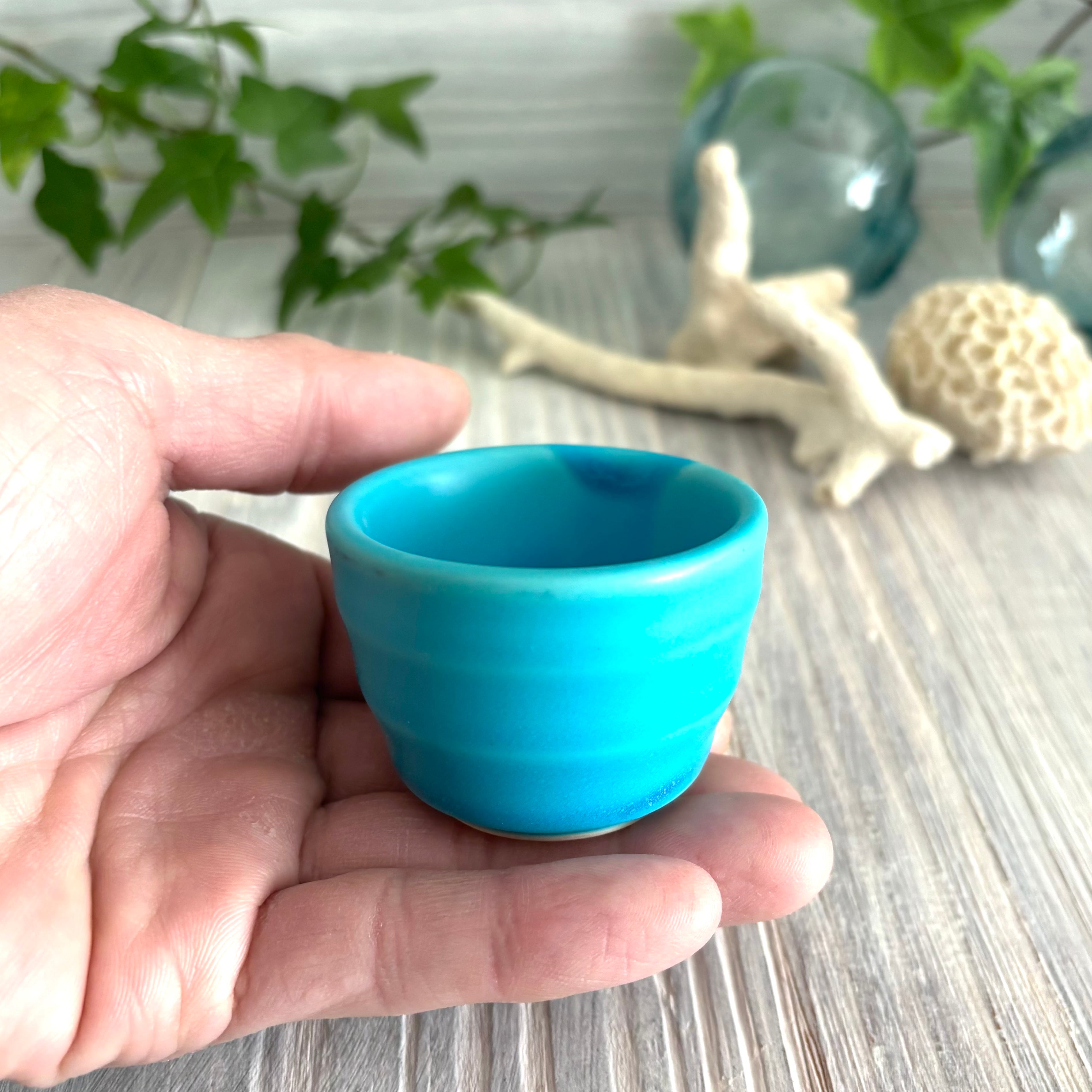 色鮮やかなマットのトルコブルーが特徴のお猪口です。やや小ぶりのお猪口は釉薬のグラデーションが美しく、ついついお酒がすすみそうです。