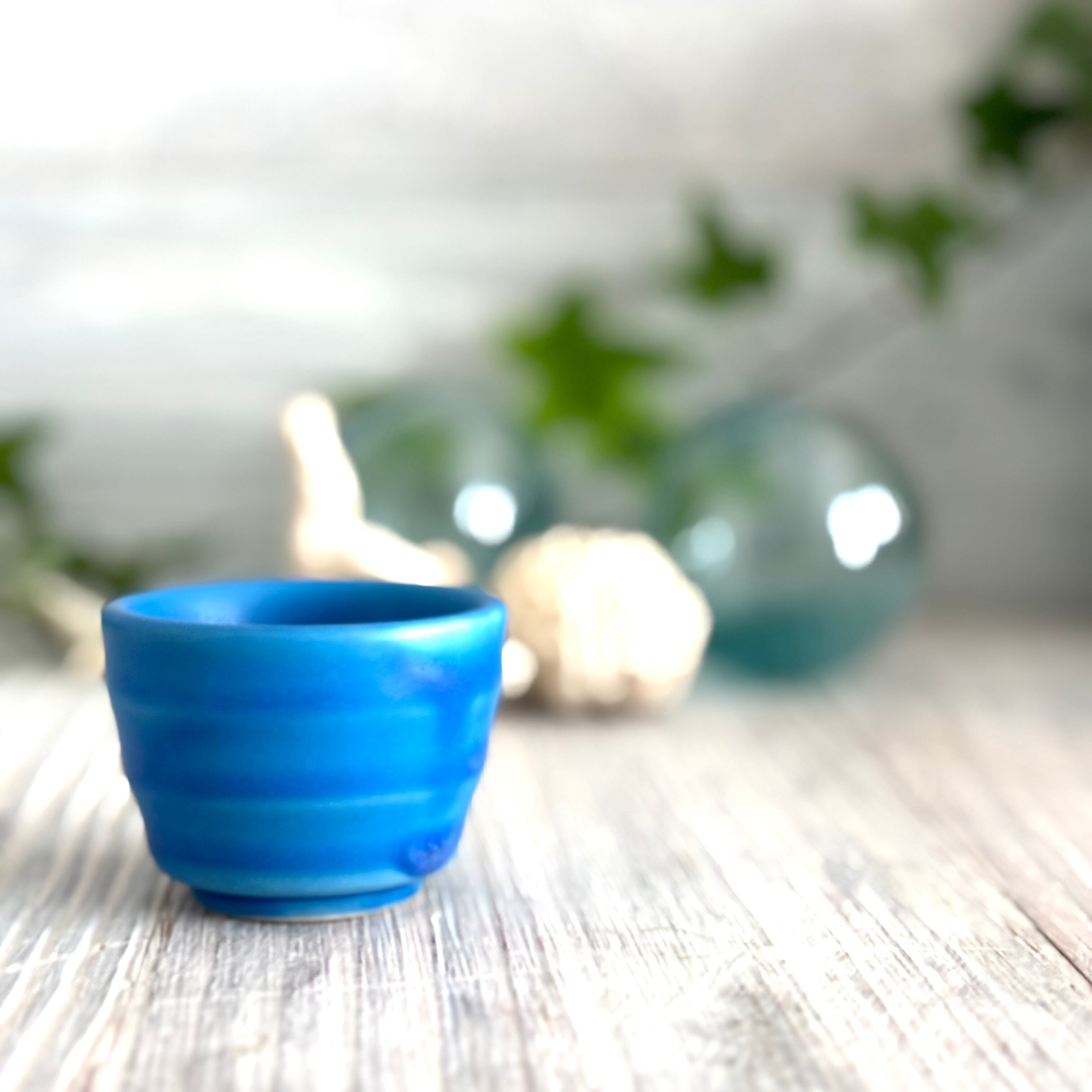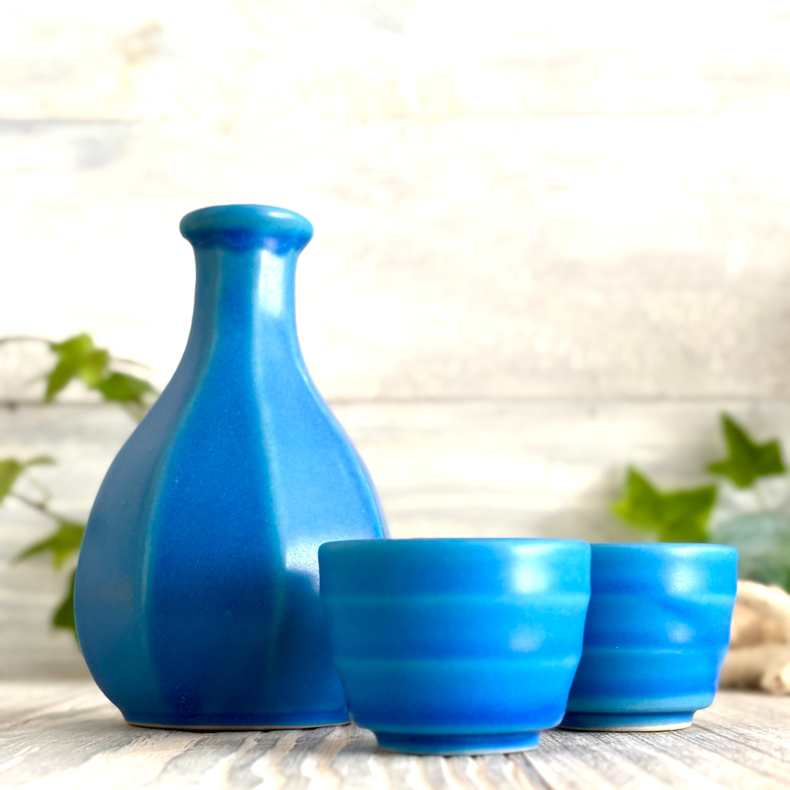 色鮮やかなマットのマリンブルーが特徴の徳利とお猪口の酒器セットです。やや小ぶりのお猪口は釉薬のグラデーションが美しく、ついついお酒がすすみそうです。