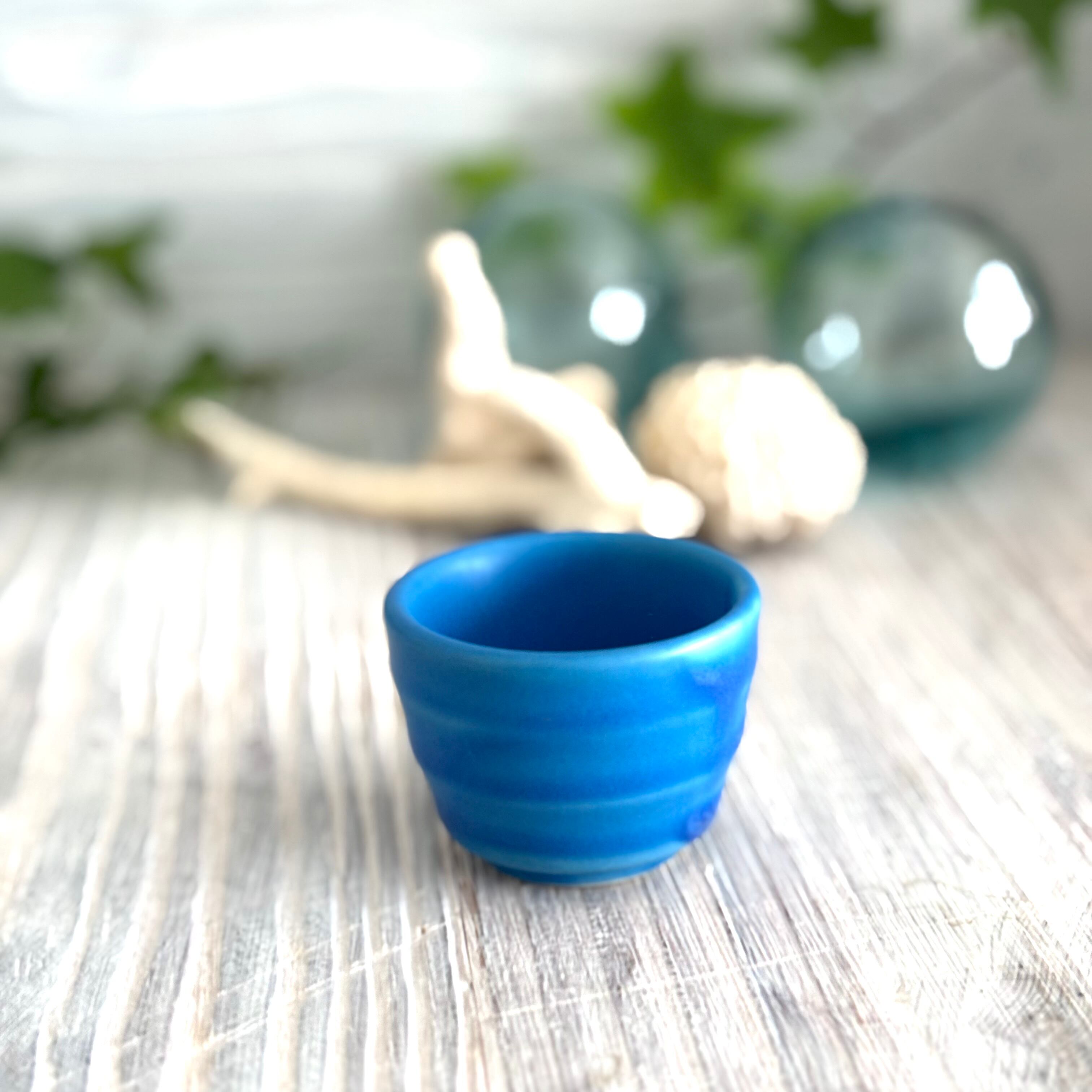 色鮮やかなマットのマリンブルーが特徴のお猪口です。やや小ぶりのお猪口は釉薬のグラデーションが美しく、ついついお酒がすすみそうです。