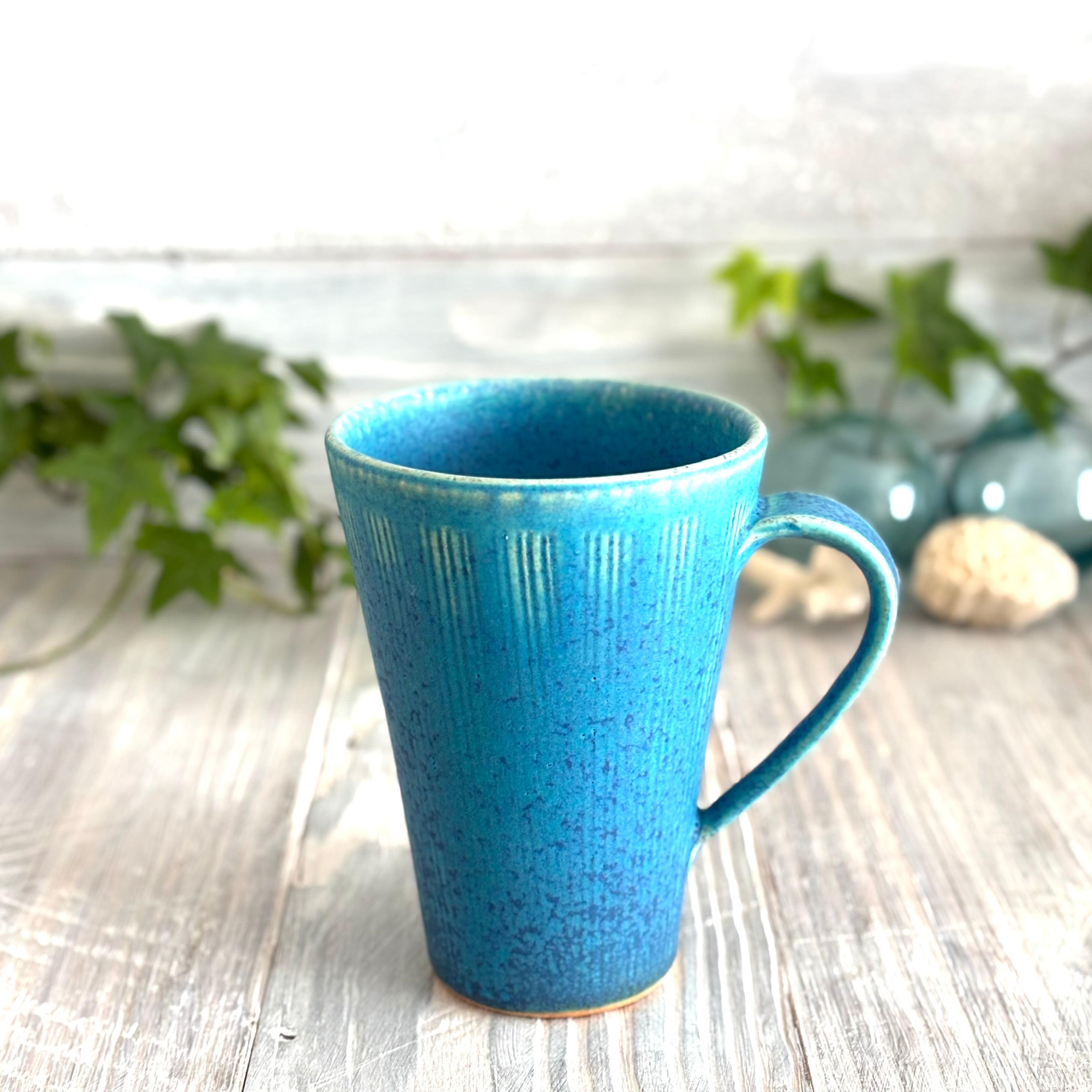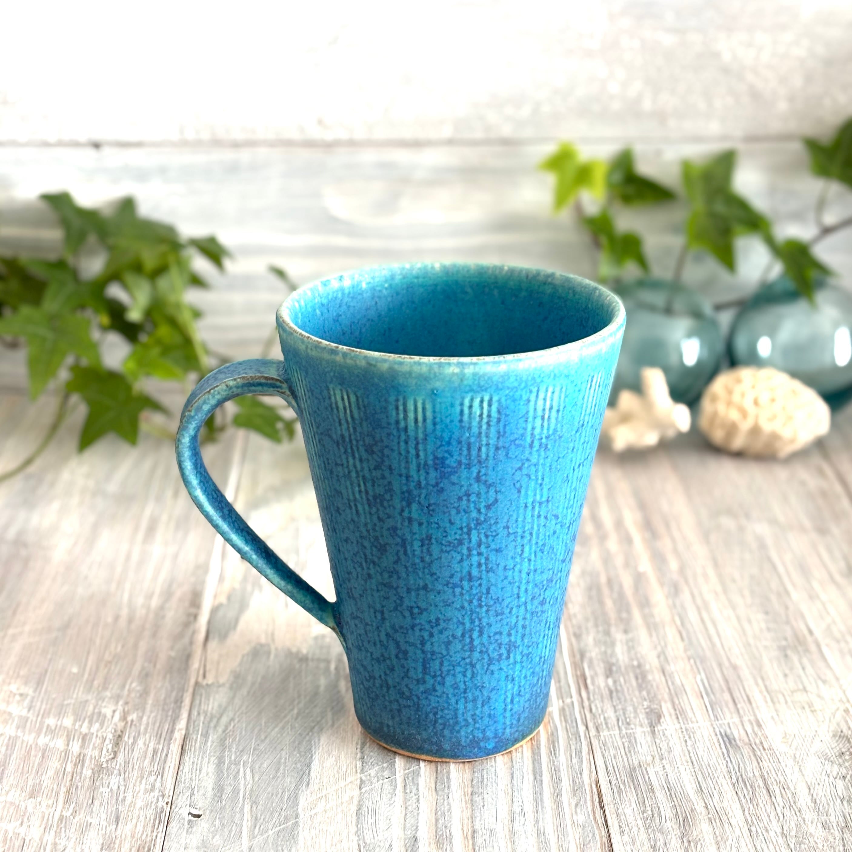 色鮮やかなマットなトルコブルーカラーに表面にくし目がついたたっぷりサイズのロングマグカップ。夏はよく冷えたビールのスモールジョッキとしても。