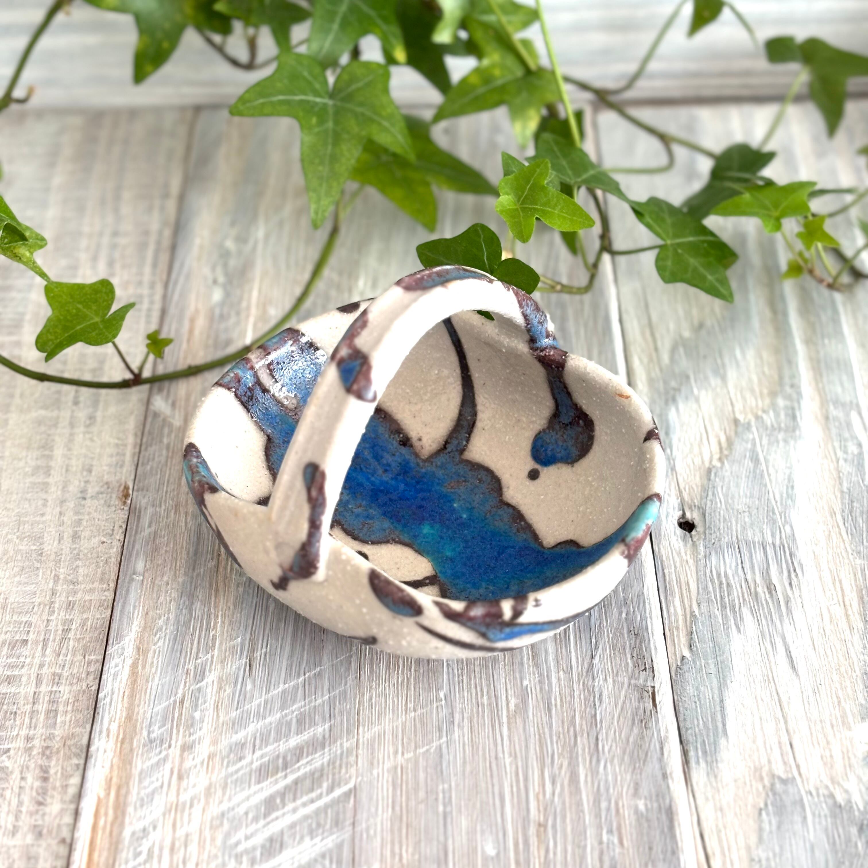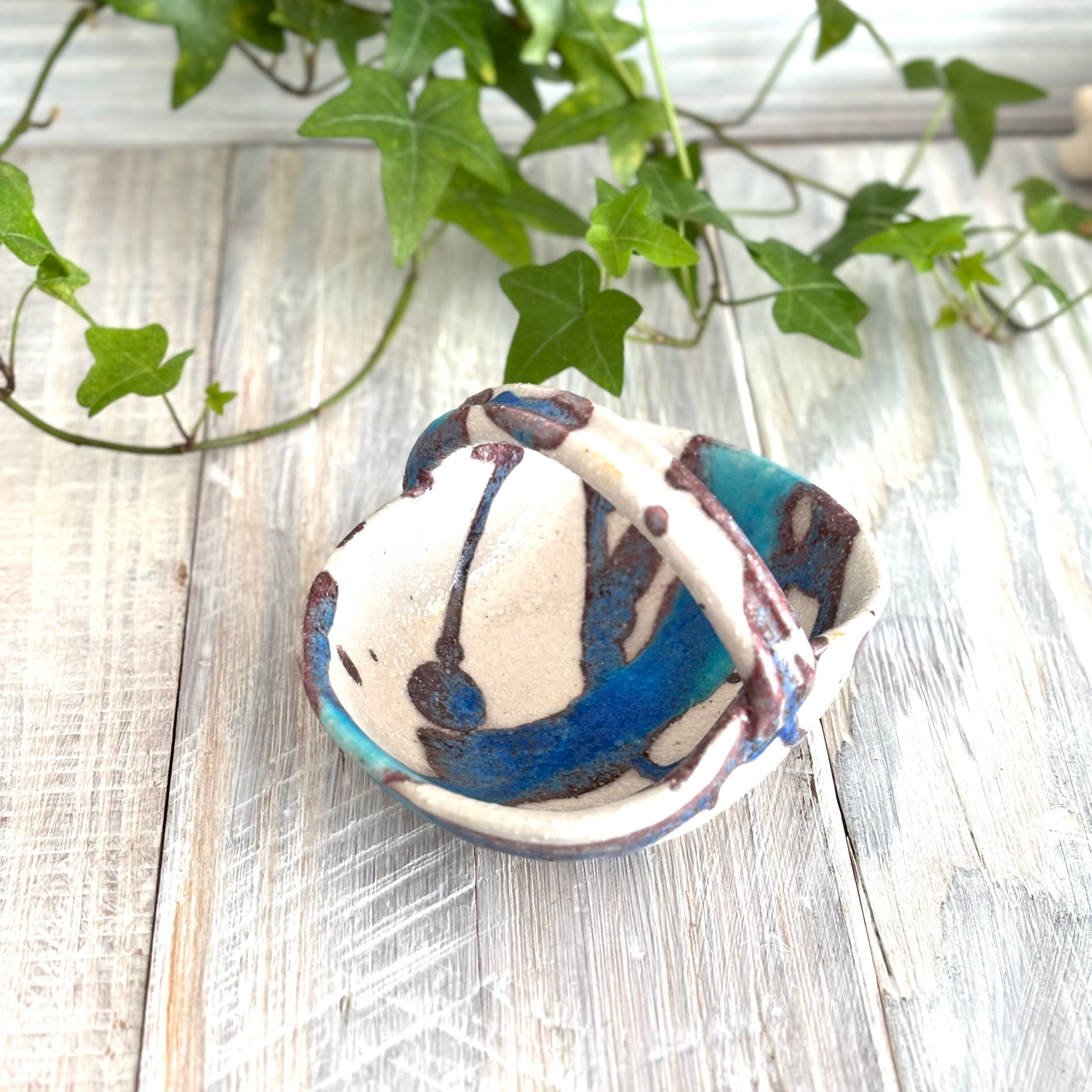 色鮮やかなトルコブルーがランダムに入った氷河シリーズの手付豆鉢です。漬物や薬味などでお食事の際にも、晩酌にナッツなどのおつまみ入れにも最適です。